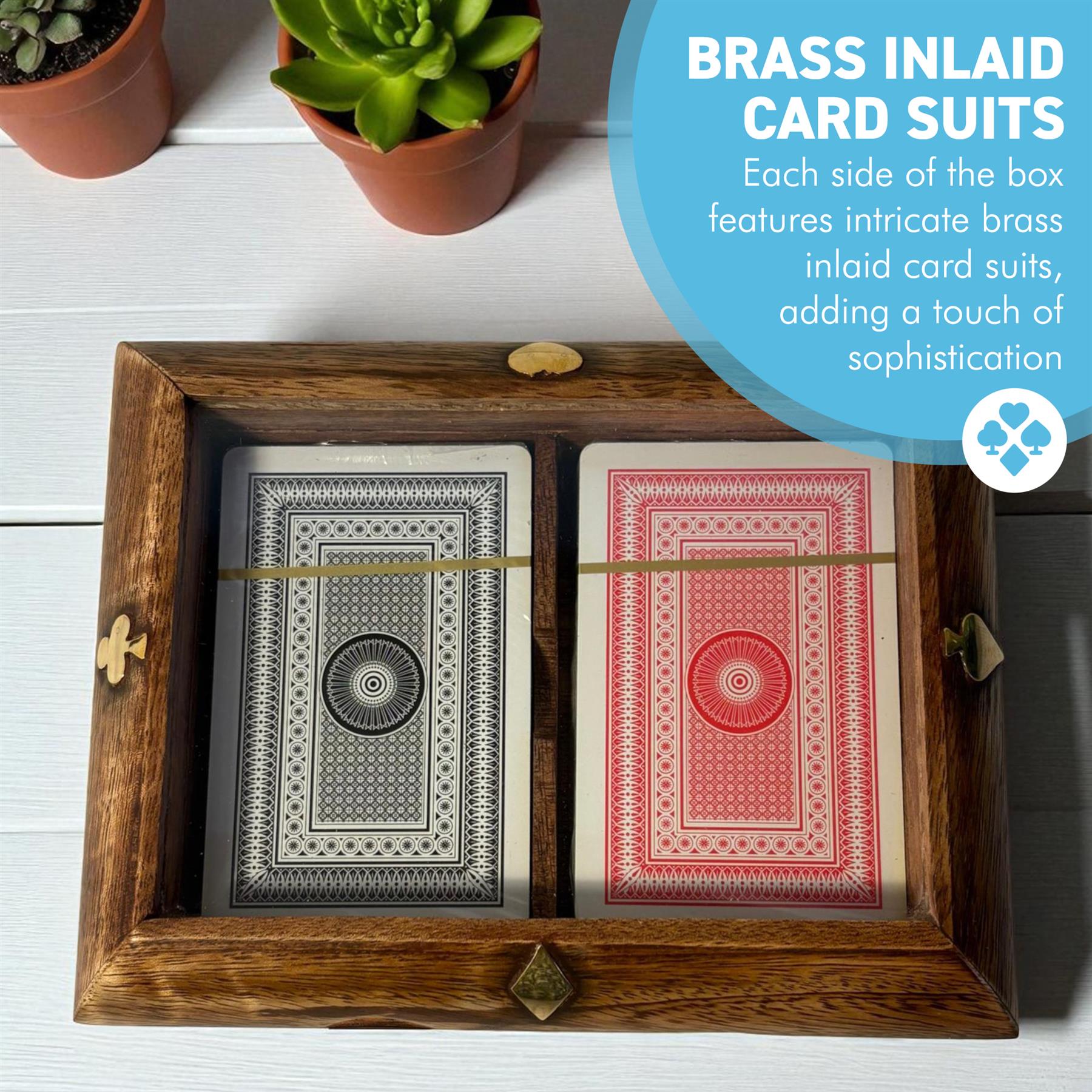 𝗕𝗥𝗔𝗦𝗦 𝗜𝗡𝗟𝗔𝗜𝗗 𝗖𝗔𝗥𝗗 𝗦𝗨𝗜𝗧𝗦: Each side of the box features intricate brass inlaid card suits, adding a touch of sophistication. Perfect for card lovers or collectors who appreciate fine craftsmanship and attention to detail in every corner.