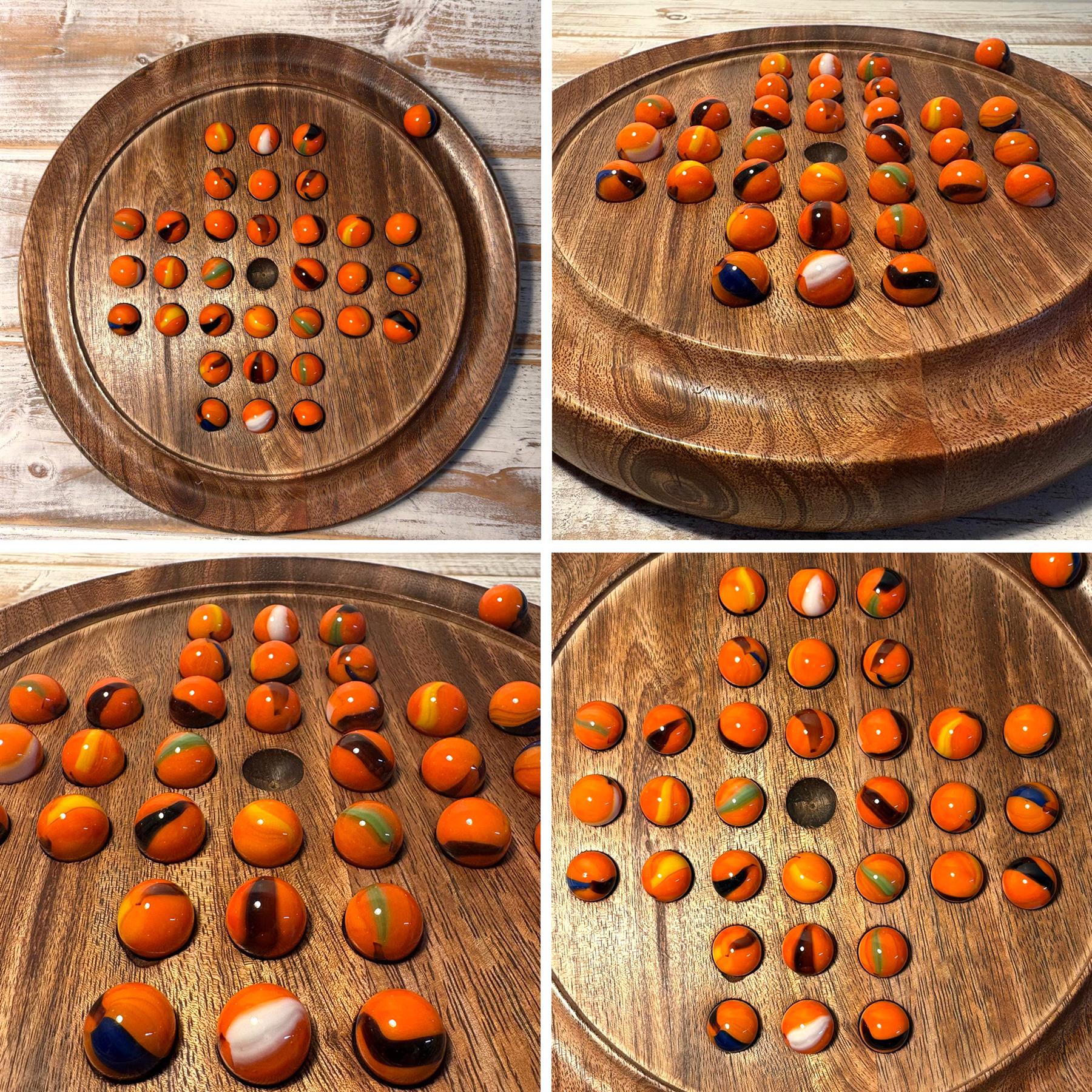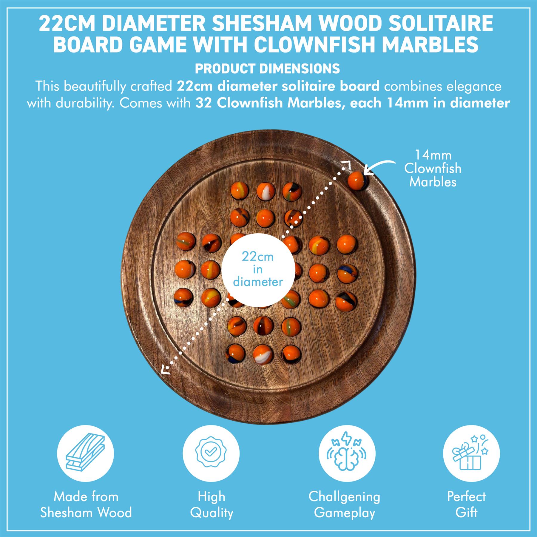 This beautifully crafted solitaire game set comes complete with a set of 32 CLOWFISH glass marbles (plus 1 spare) which sit upon a circular board of dark wood to create a stunning contrast between the pieces, the grooved perimeter allows the spare marbles to stay close at hand.