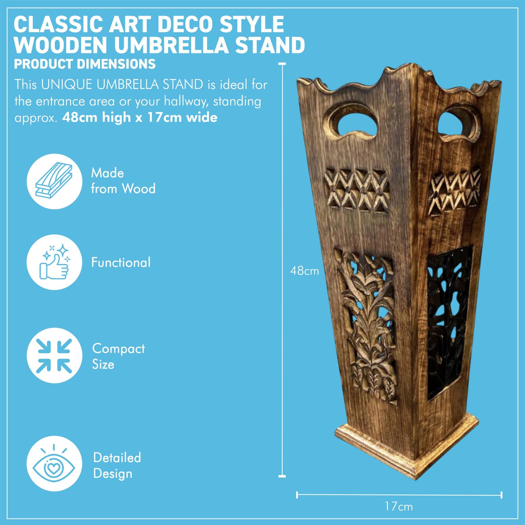 DIMENSIONS - This unique umbrella stand, measuring 48cm high and 17cm wide, enhances any hallway with its classic art deco style. With ample storage, it keeps your umbrellas organized while adding a stylish touch to your decor.