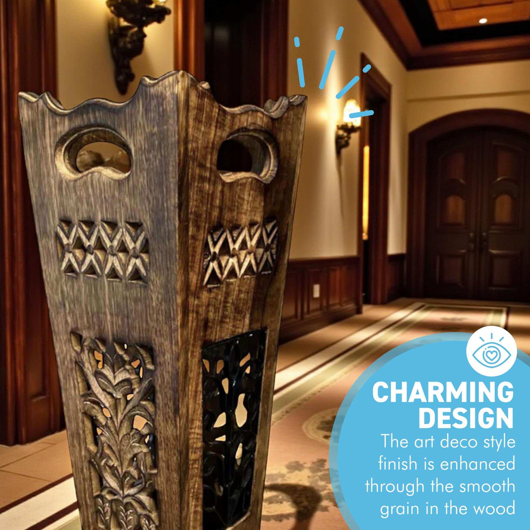 PRACTICAL STORAGE - Enhance your living space with this wooden umbrella holder, featuring art deco geometric patterns and a smooth wooden surface. This stylish umbrella stand is ideal for hallway furniture and offers practical storage while elevating your homes decor.