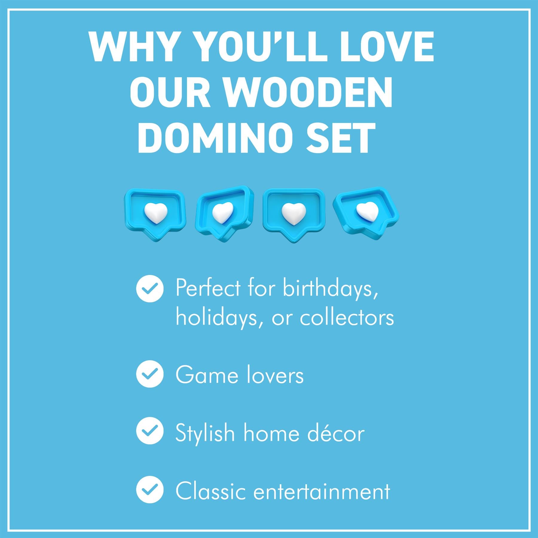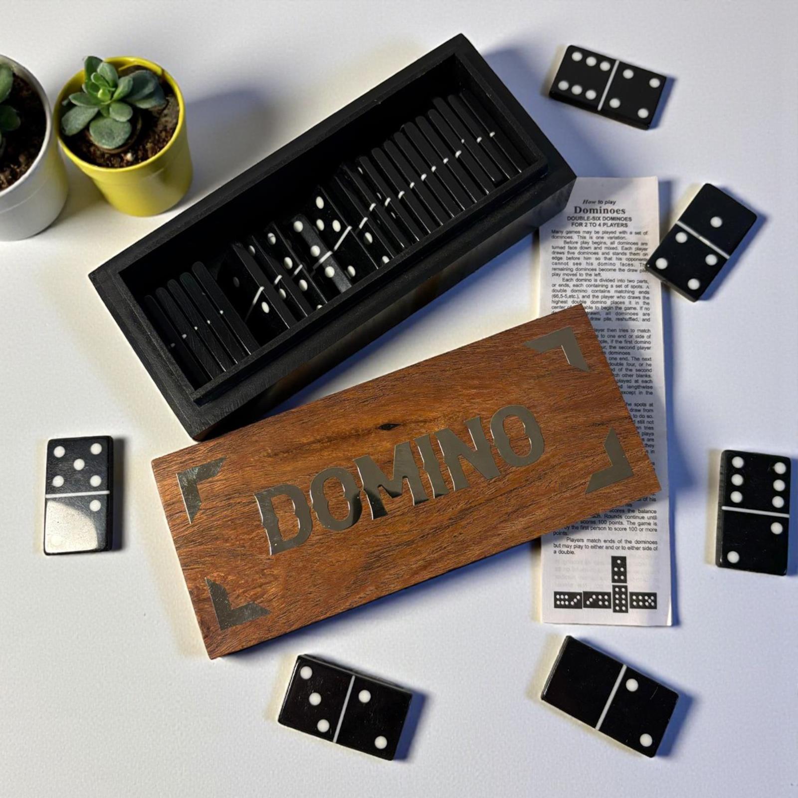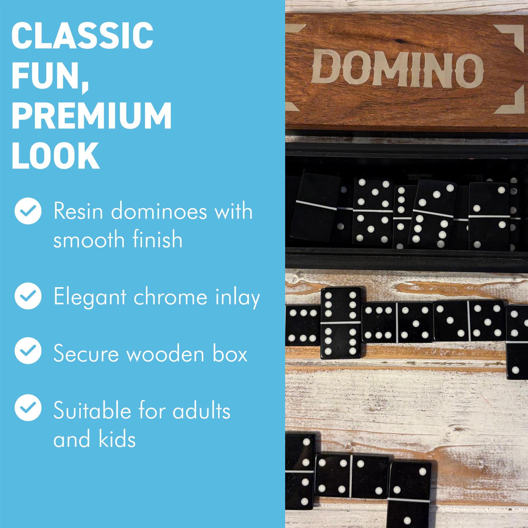 𝗦𝗧𝗬𝗟𝗜𝗦𝗛 𝗖𝗛𝗥𝗢𝗠𝗘 𝗜𝗡𝗟𝗔𝗬 𝗟𝗜𝗗: Features the word “Domino” in chrome inlay for a classy, premium look. Makes the set perfect as a gift or for display.