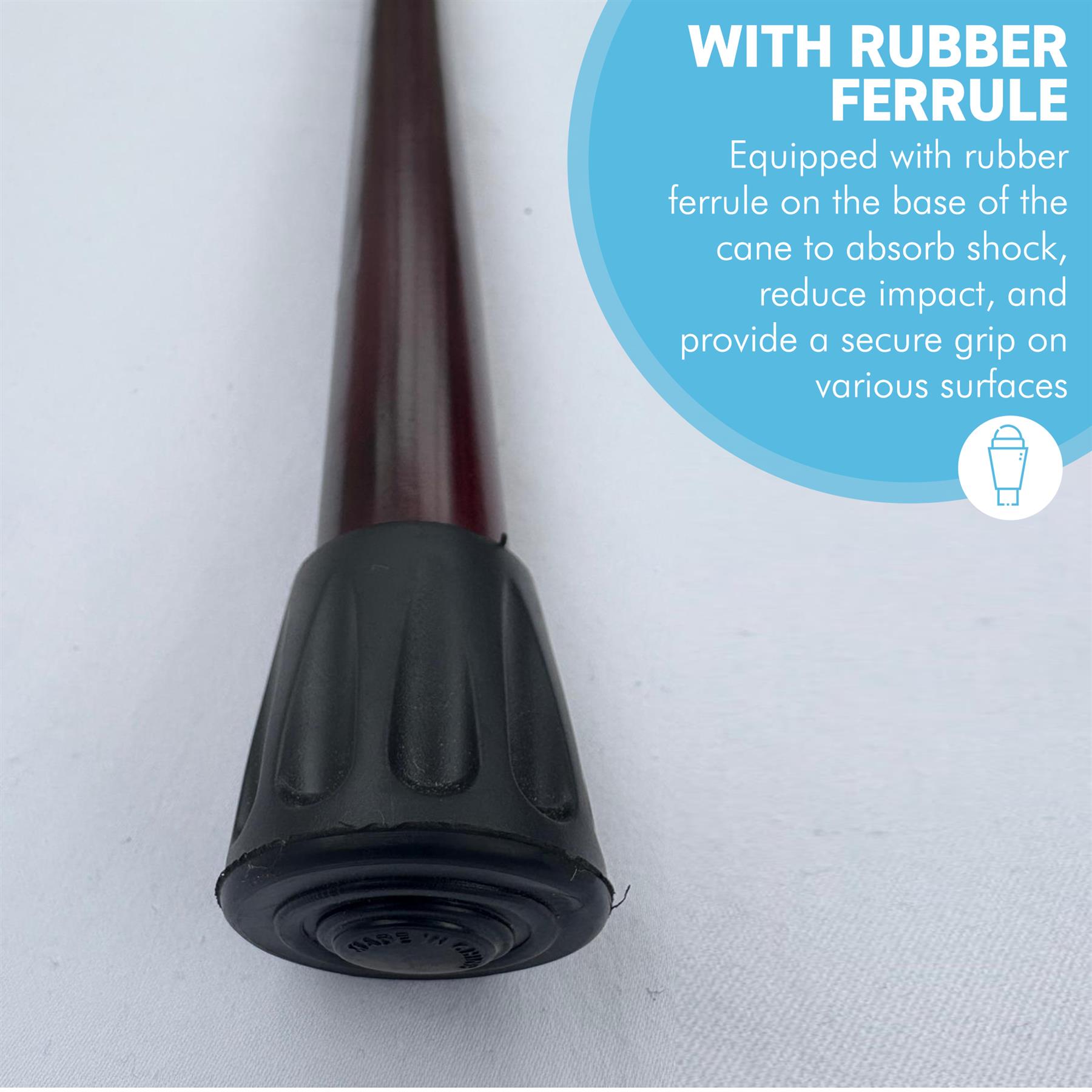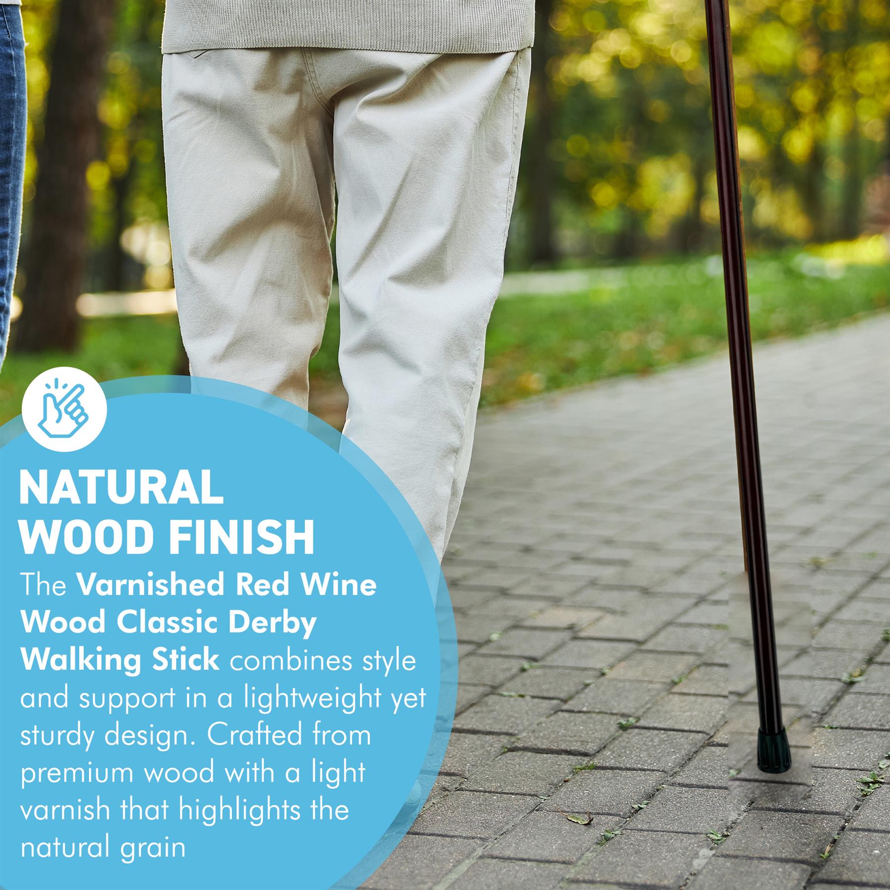 The Derby handle is ergonomically designed for a comfortable grip, reducing strain on your hand and wrist while providing greater control. This design is ideal for seniors and individuals with mobility challenges, offering the necessary support for daily walking, whether indoors or outdoors. The rubber ferrule on the bottom ensures stability and safety by providing a firm grip on a variety of surfaces, preventing slips and offering a smooth walking experience.