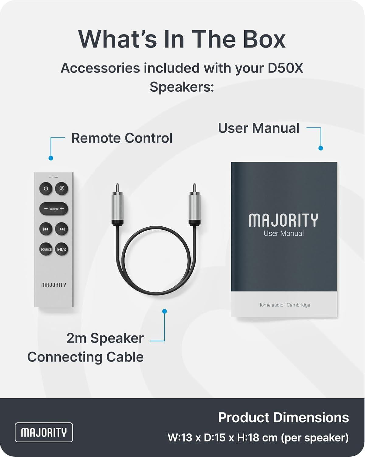 ๐๐๐ง๐๐ฉ๐ ๐๐-๐๐ ๐ฃ๐๐ฅ๐๐ข๐ฅ๐ ๐๐ก๐๐: Enjoy true high-fidelity sound straight out of the box. With a powerful built-in amplifier, the Majority D50X speakers wireless Bluetooth system delivers authentic Hi-Fi stereo audio without the need for extra equipment. Engineered for clarity and precision, itโs the perfect upgrade for music lovers and movie fans, with Auto Standby mode that automatically switches to standby after inactivity to save energy. Designed in Cambridge, UK, each speaker measures 13.6ร15ร18 cm and weighs 2.8 kg in total.