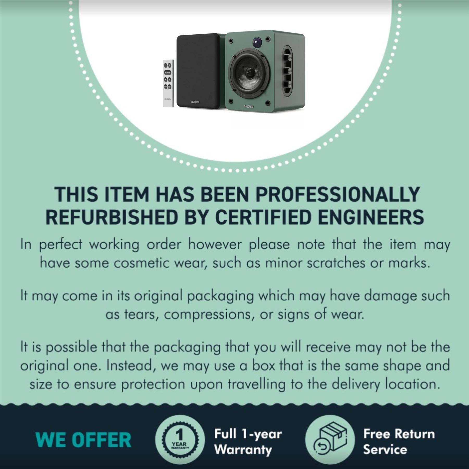 ๐๐ ๐ ๐๐ฅ๐ฆ๐๐ฉ๐ ๐๐๐ฆ๐๐ง๐ข๐ฃ ๐๐จ๐๐๐ข: Designed for accuracy, the Majority D50X Green bookshelf speakers for monitor bring dialogue, vocals, and every detail to life. Whether youโre watching films, editing projects, or streaming your favourite content, youโll experience rich depth and clean, defined sound that enhances any workspace or home setup. Includes 2ร Majority D50X White Bluetooth desktop speakers, 1ร Remote Control, Speakers connecting cable, and 1ร User Manual.