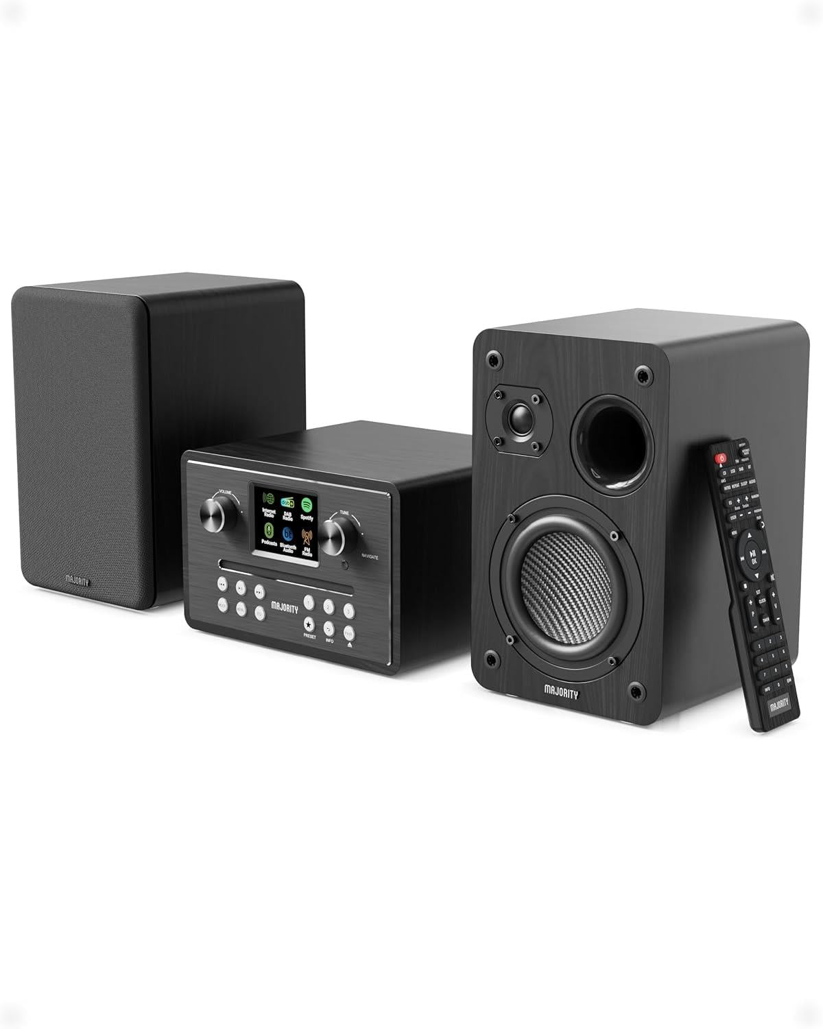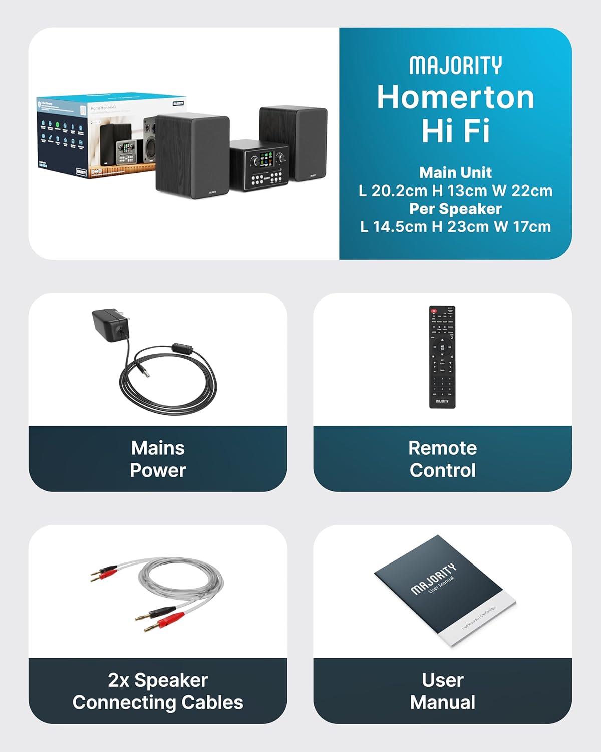𝗪𝗛𝗔𝗧𝗦 𝗜𝗡 𝗧𝗛𝗘 𝗕𝗢𝗫: Majority Homerton HiFi main unit, 2x stereo speakers, 2x speaker connection cables, power adaptor, remote control, and user guide. Dimensions: Main Unit - 20.2 x 13 x 22cm, Speakers - 14.5 x 23 x 17cm each.