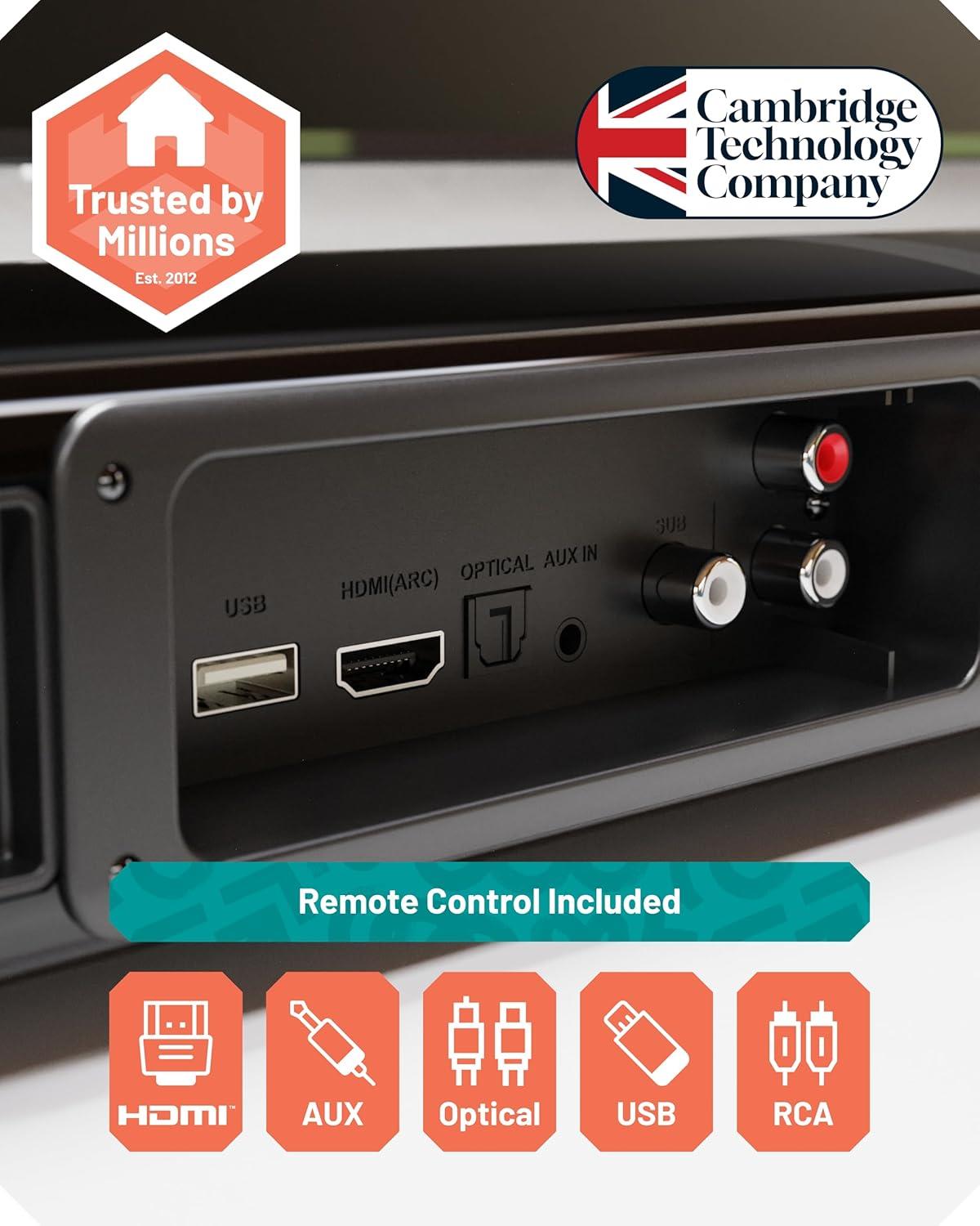 𝗛𝗗𝗠𝗜 𝗔𝗥𝗖, 𝗢𝗣𝗧𝗜𝗖𝗔𝗟, 𝗔𝗨𝗫 & 𝗨𝗦𝗕 – Connect to your TV, console, PC or music player with multiple inputs. USB port supports playback only (MP3, FLAC, WAV) from drives up to 64GB.