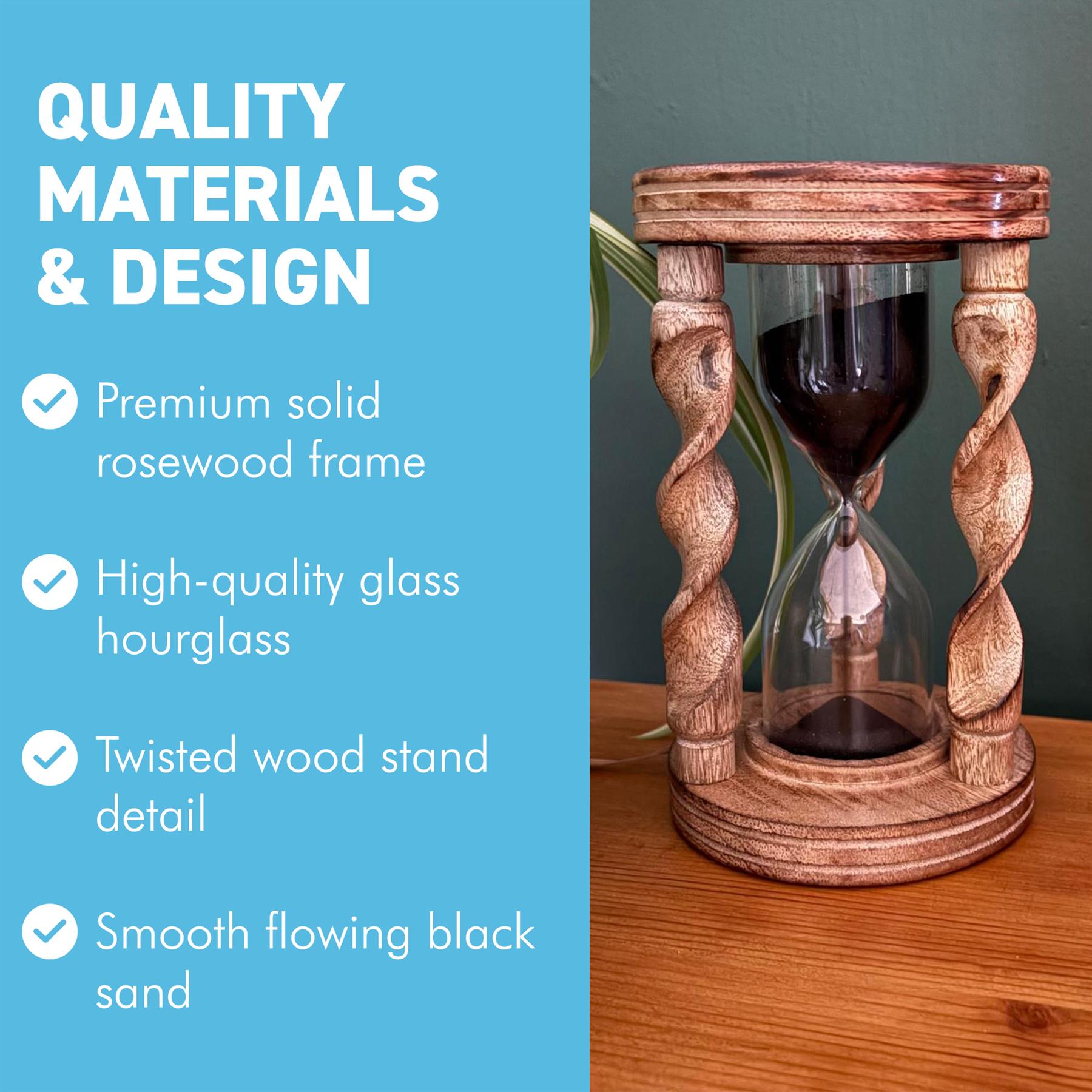 𝗗𝗨𝗥𝗔𝗕𝗟𝗘, 𝗛𝗜𝗚𝗛-𝗤𝗨𝗔𝗟𝗜𝗧𝗬 𝗠𝗔𝗧𝗘𝗥𝗜𝗔𝗟𝗦: Made from premium solid wood and high-quality glass, this sand timer is built to last. The sturdy wooden frame ensures stability and protects the glass, while the twisted wood accents enhance its visual appeal and strength.