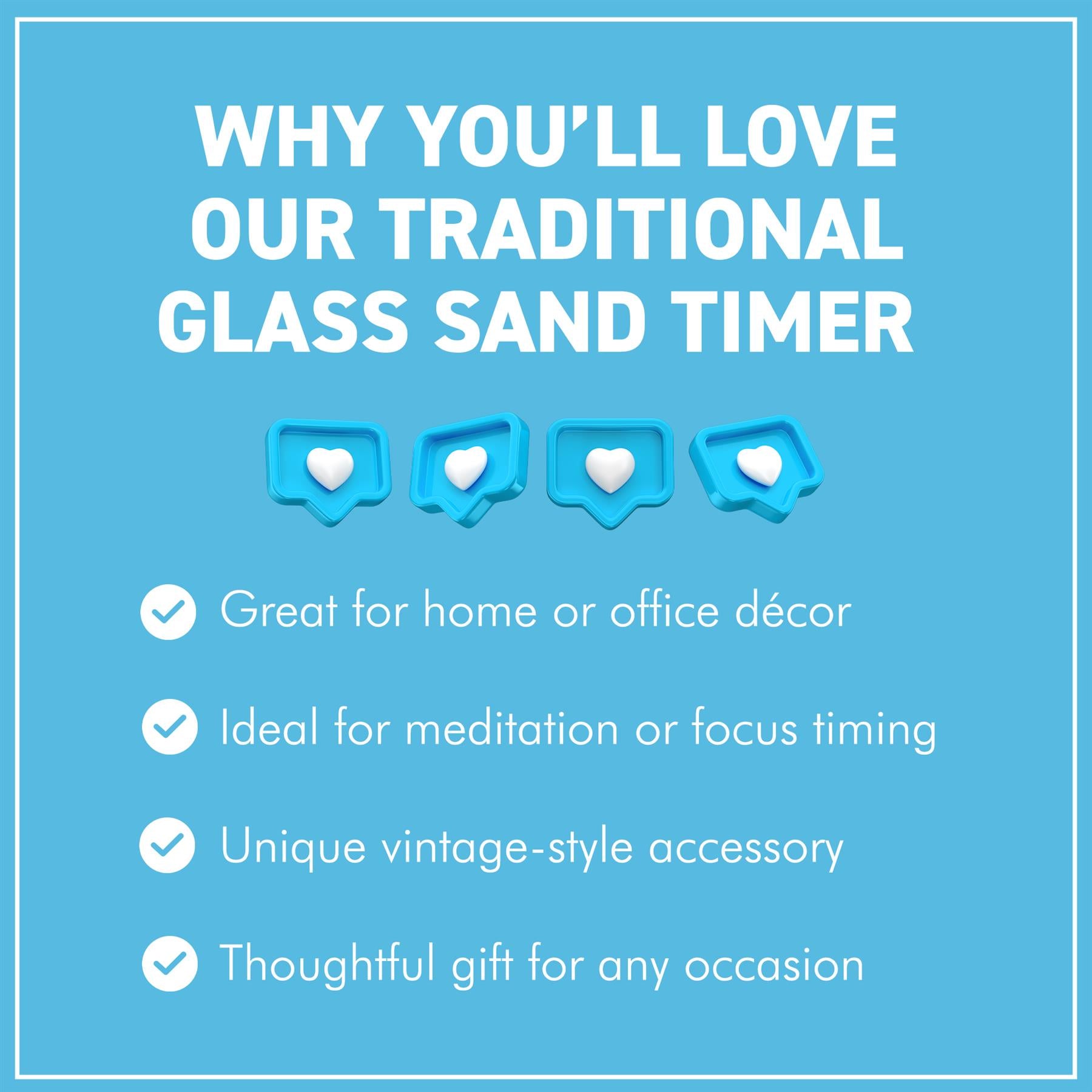 𝗖𝗢𝗠𝗣𝗔𝗖𝗧 𝗔𝗡𝗗 𝗖𝗢𝗡𝗩𝗘𝗡𝗜𝗘𝗡𝗧 𝗦𝗜𝗭𝗘: Measuring 17 cm (6.7 in) in height and 10 cm (3.9 in) in diameter, this elegant hourglass fits seamlessly on desks, shelves, or kitchen counters. Its compact design provides both functionality and style without taking up too much space.