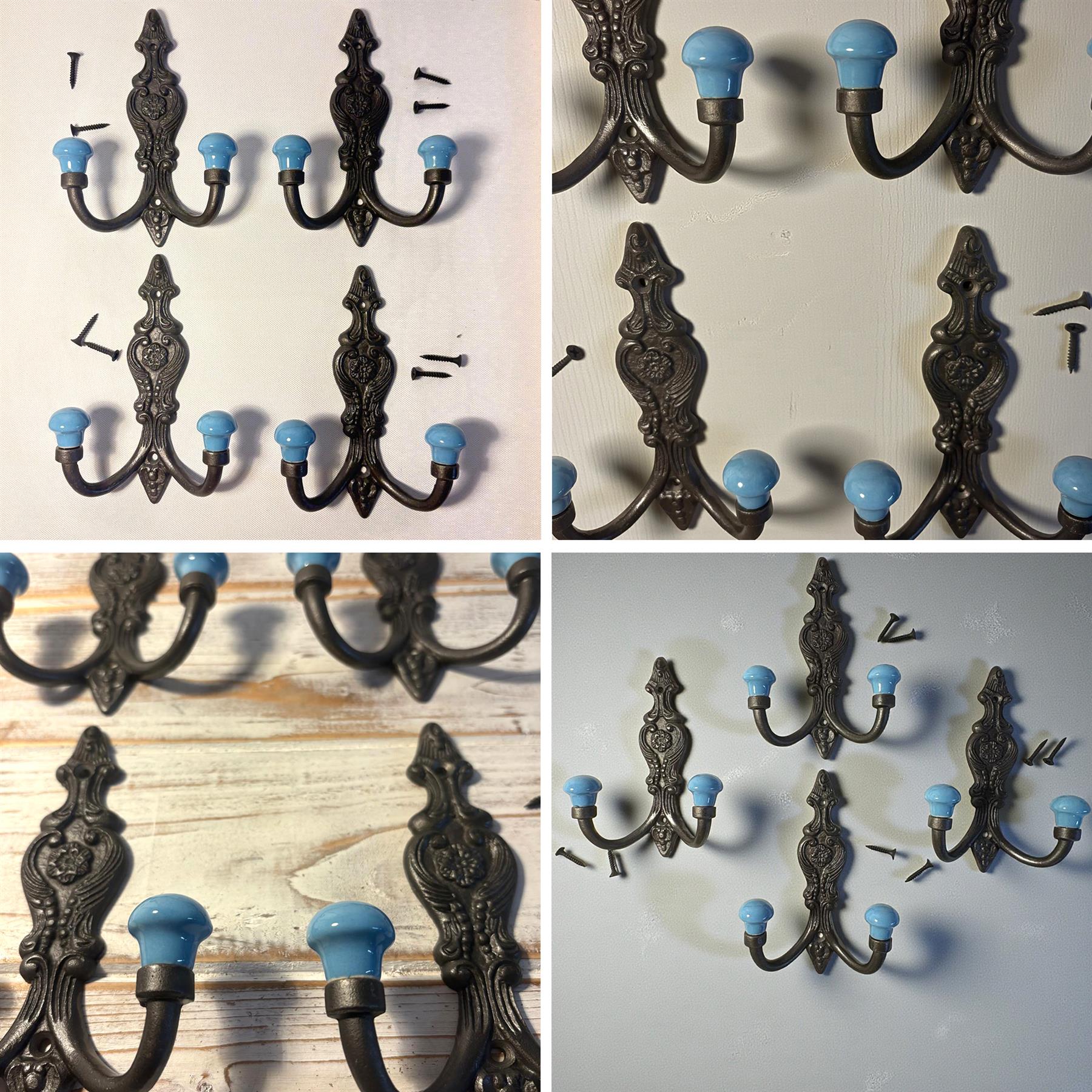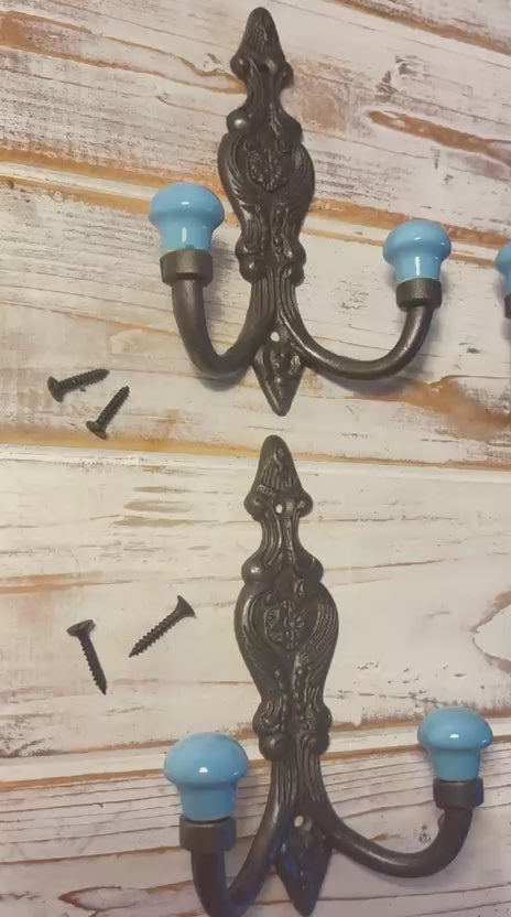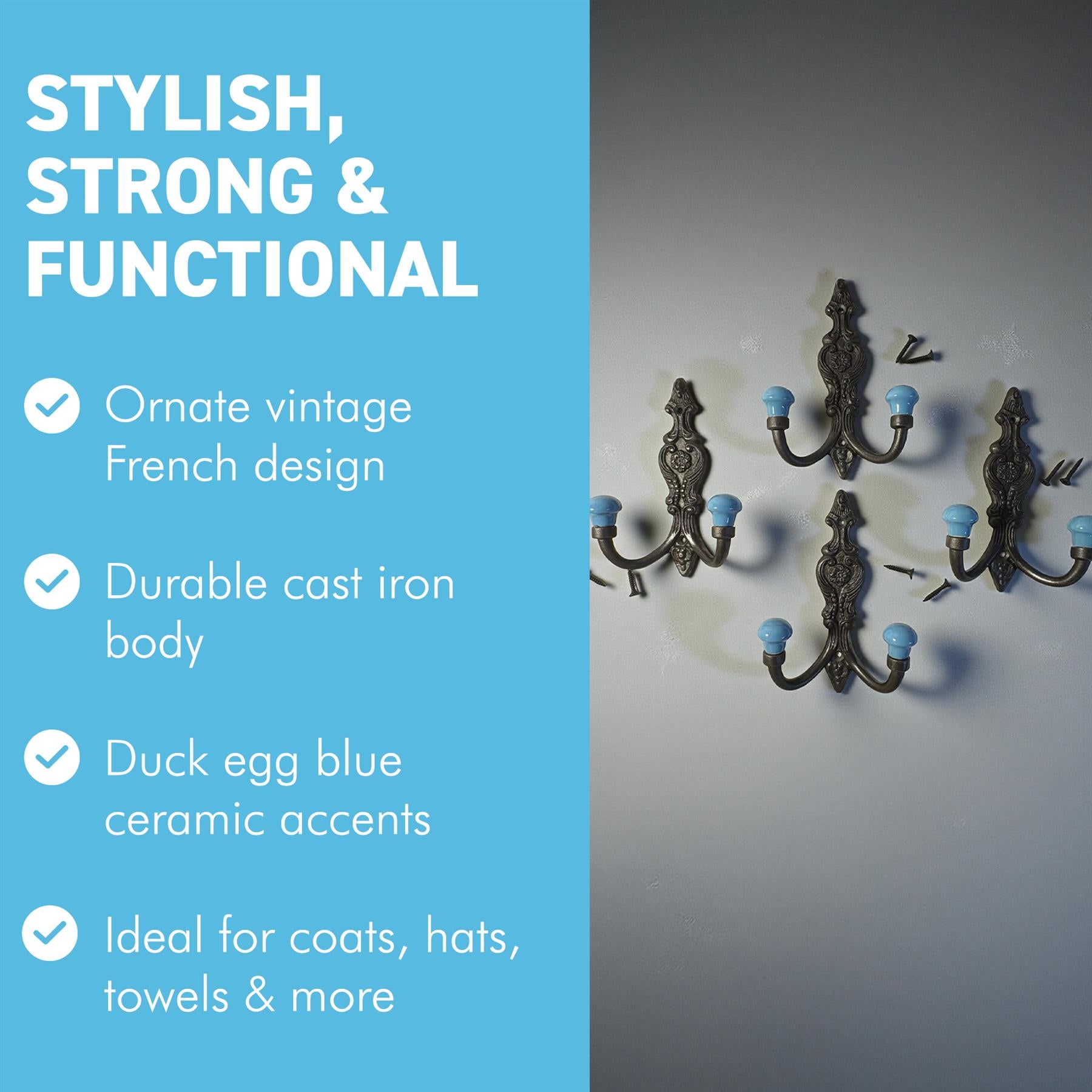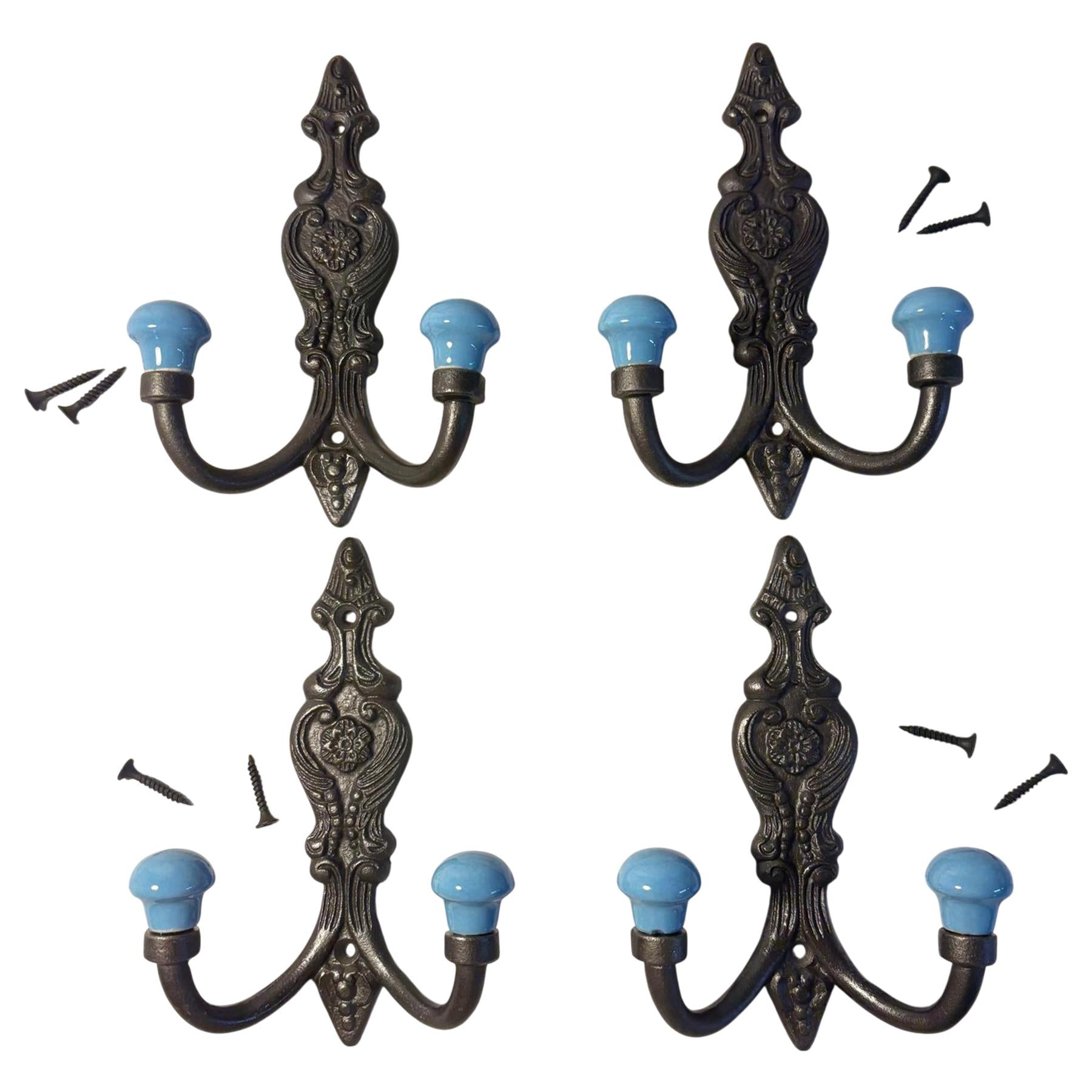 Set of 4 𝗙𝗥𝗘𝗡𝗖𝗛 𝗦𝗧𝗬𝗟𝗘 𝗖𝗔𝗦𝗧 𝗜𝗥𝗢𝗡 𝗗𝗢𝗨𝗕𝗟𝗘 𝗛𝗢𝗢𝗞𝗦 – Duck Egg Blue Ceramic Tops, Wall Coat Hooks for Hallway, Cloakroom, Bedroom