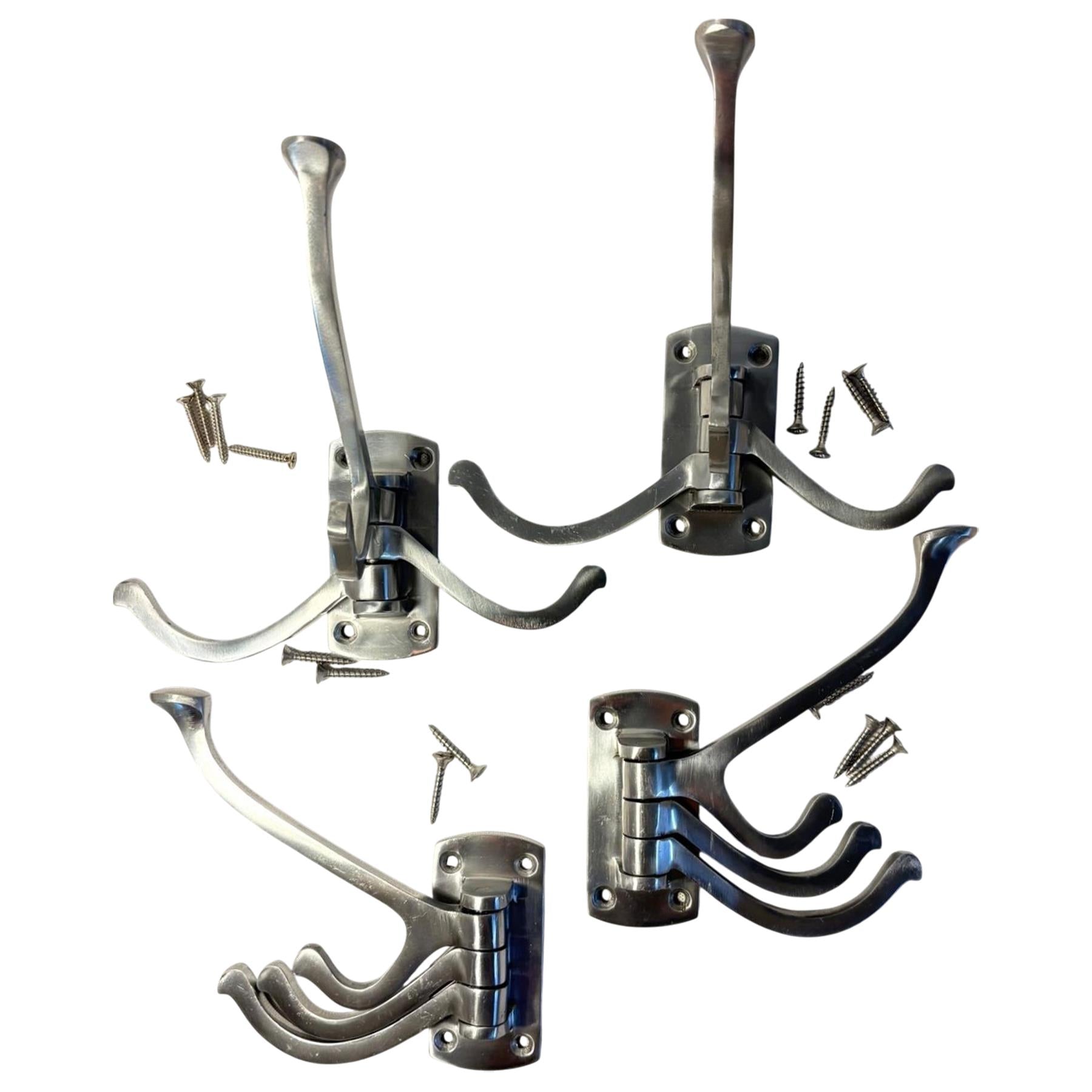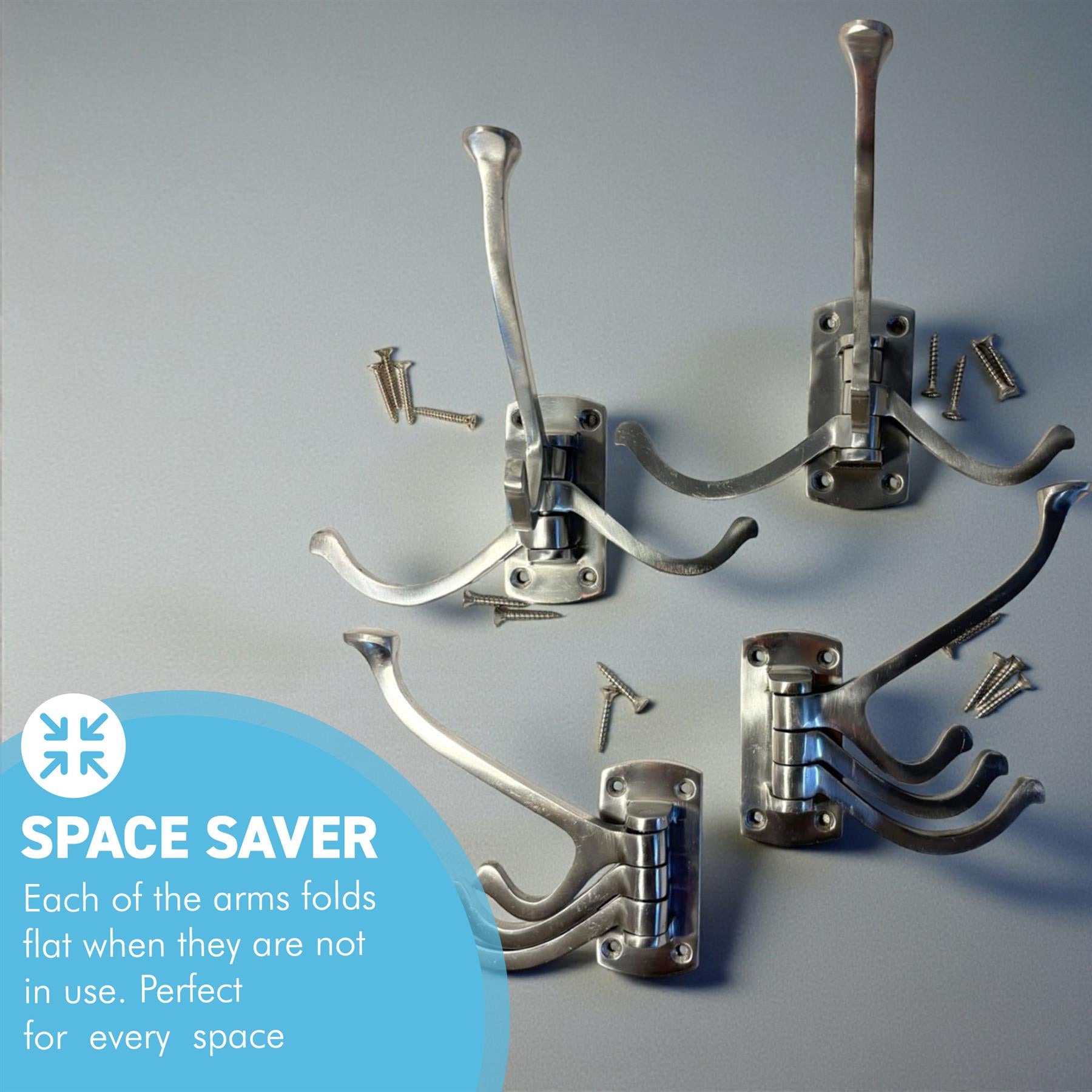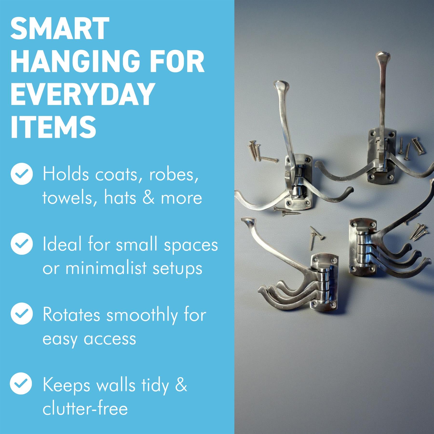𝗦𝗣𝗔𝗖𝗘-𝗦𝗔𝗩𝗜𝗡𝗚 𝗦𝗪𝗜𝗩𝗘𝗟 𝗗𝗘𝗦𝗜𝗚𝗡 : This set of four swivel hooks will maximise small walls with this aluminium triple swivel hook. Folding arms tuck flat when not in use, keeping bathrooms, hallways, bedrooms, and utility spaces tidy. Design inspired by 1890–1960 period adds vintage charm.