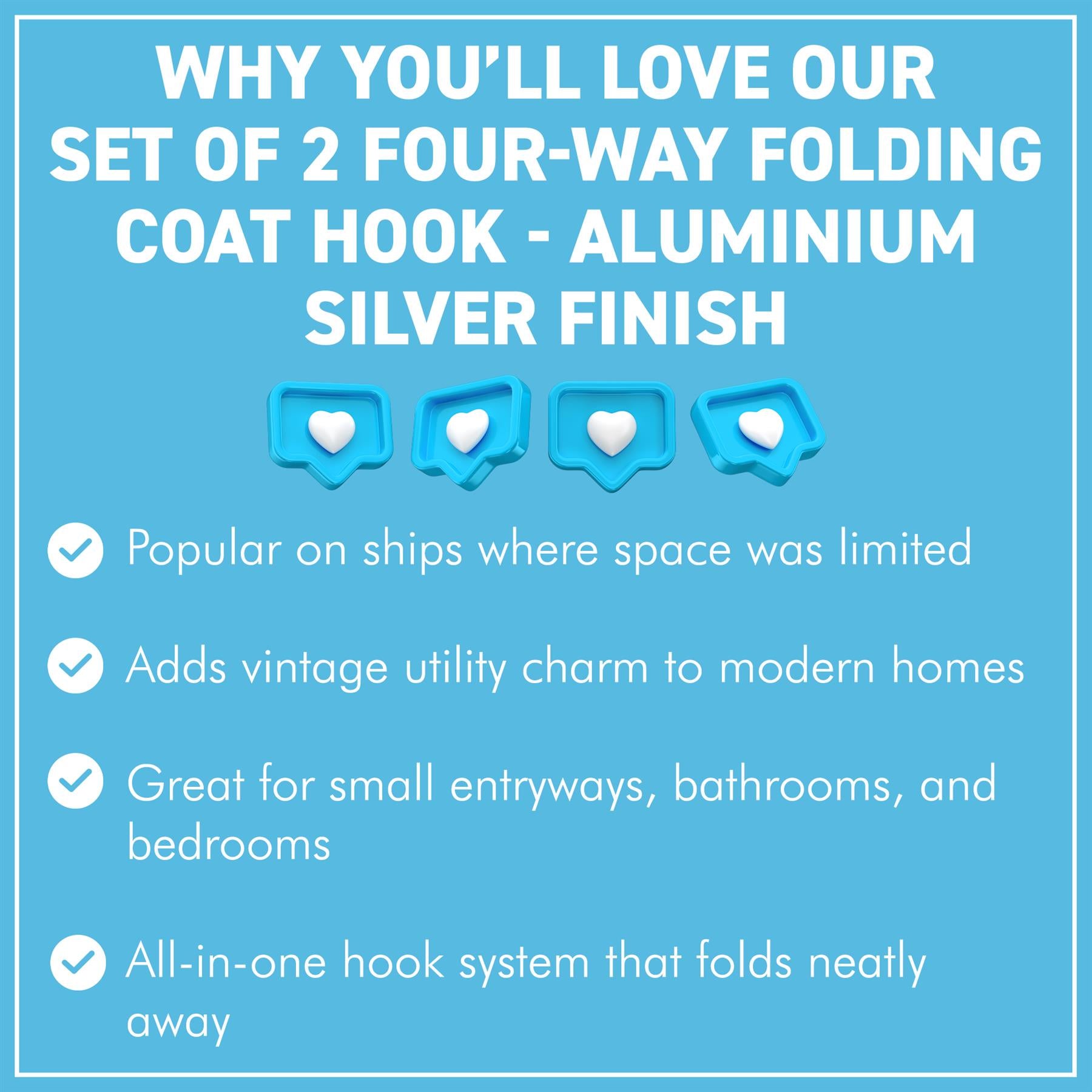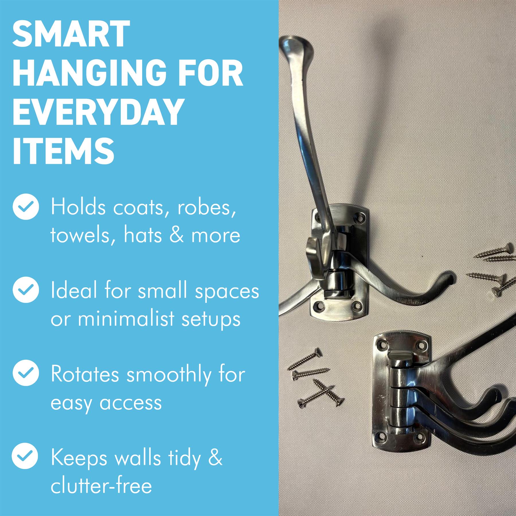 𝗦𝗣𝗔𝗖𝗘-𝗦𝗔𝗩𝗜𝗡𝗚 𝗦𝗪𝗜𝗩𝗘𝗟 𝗗𝗘𝗦𝗜𝗚𝗡 : This set of two swivel hooks will maximise small walls with this aluminium triple swivel hook. Folding arms tuck flat when not in use, keeping bathrooms, hallways, bedrooms, and utility spaces tidy. Design inspired by 1890–1960 period adds vintage charm.