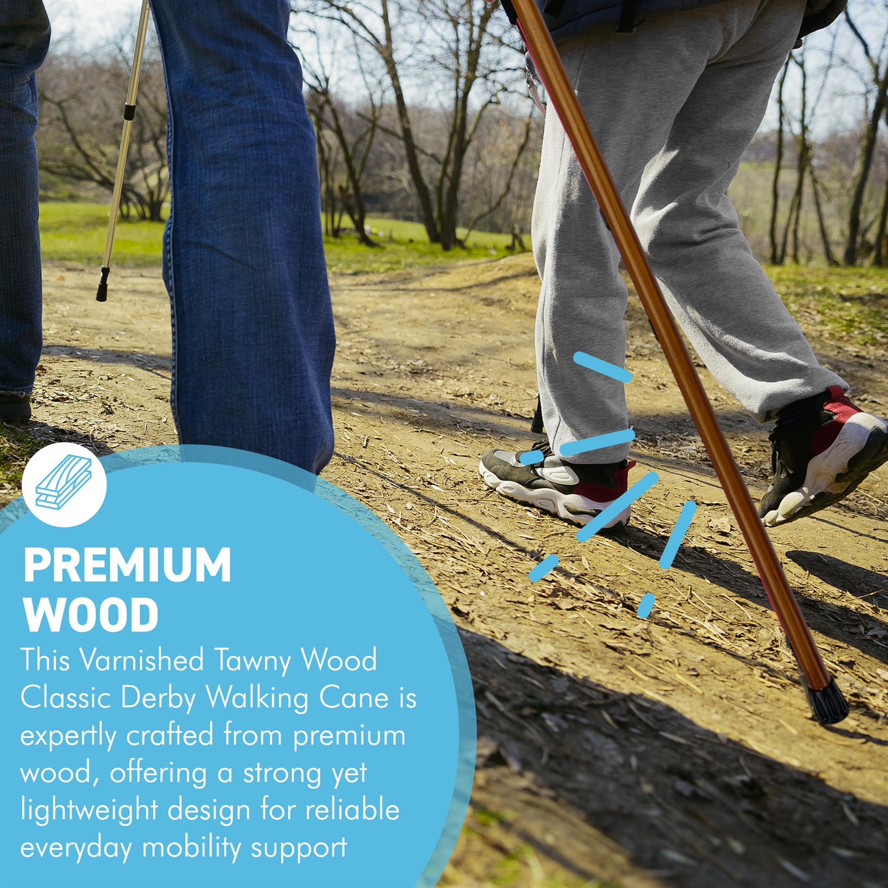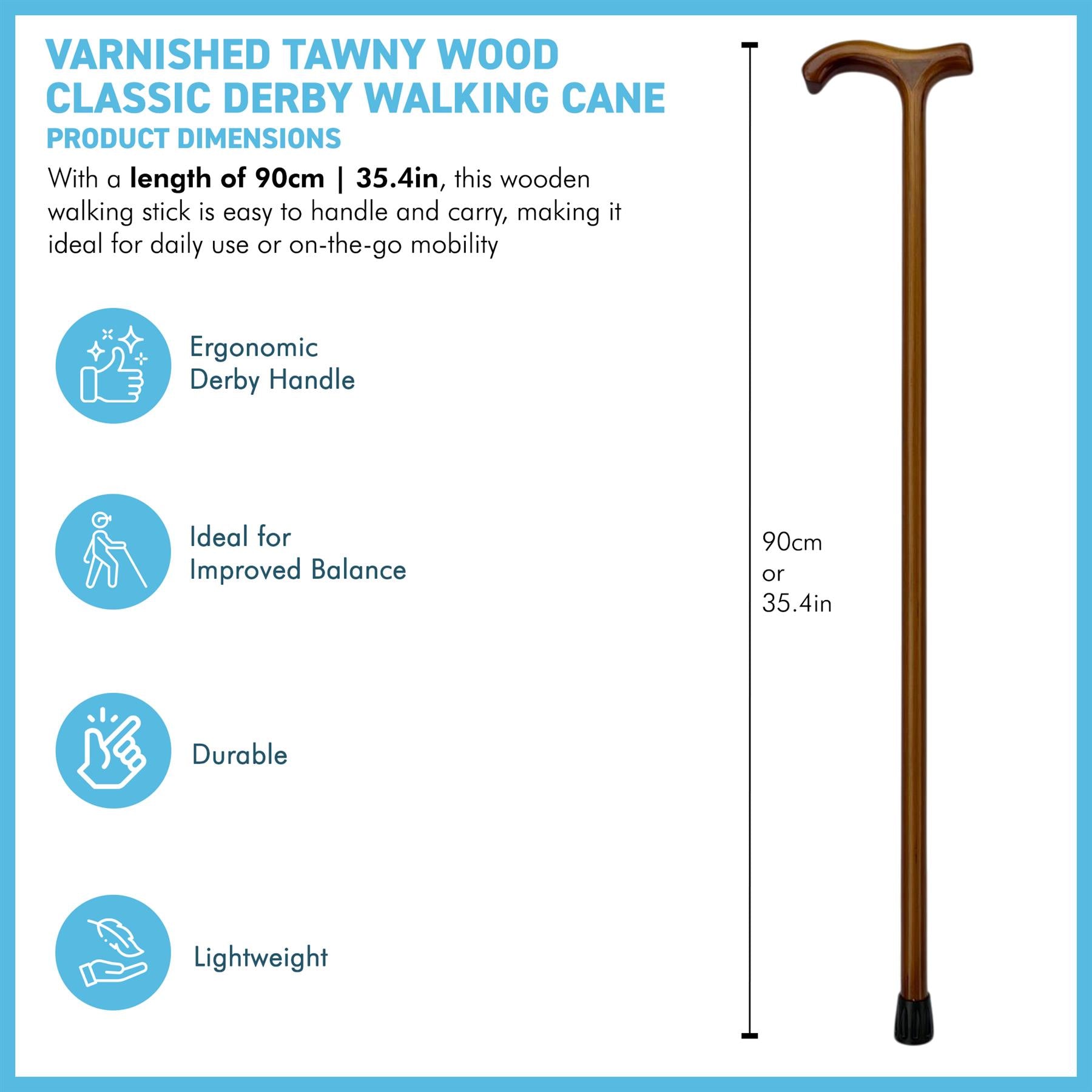 The Varnished Tawny Wood Classic Derby Walking Cane is a beautifully crafted, solid wooden stick designed to offer both style and support for those who need assistance with mobility. Made from premium wood, this walking cane boasts a lightweight yet solid construction, providing durability and reliability. The elegant Tawny varnish enhances the natural wood grain, giving the cane a timeless and sophisticated appearance that complements any wardrobe.