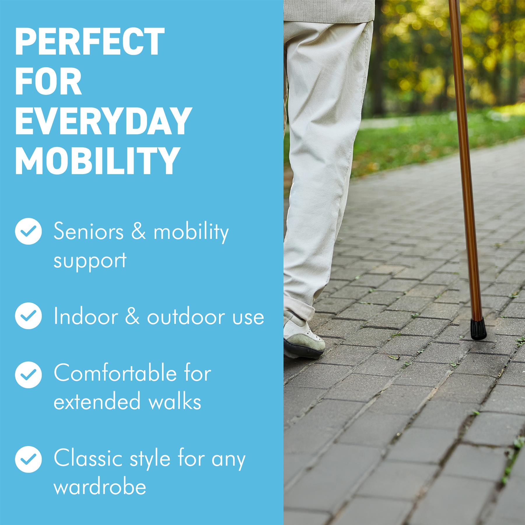 The Derby handle is ergonomically designed for a comfortable grip, reducing strain on your hand and wrist while providing greater control. This design is ideal for seniors and individuals with mobility challenges, offering the necessary support for daily walking, whether indoors or outdoors. The rubber ferrule on the bottom ensures stability and safety by providing a firm grip on a variety of surfaces, preventing slips and offering a smooth walking experience.