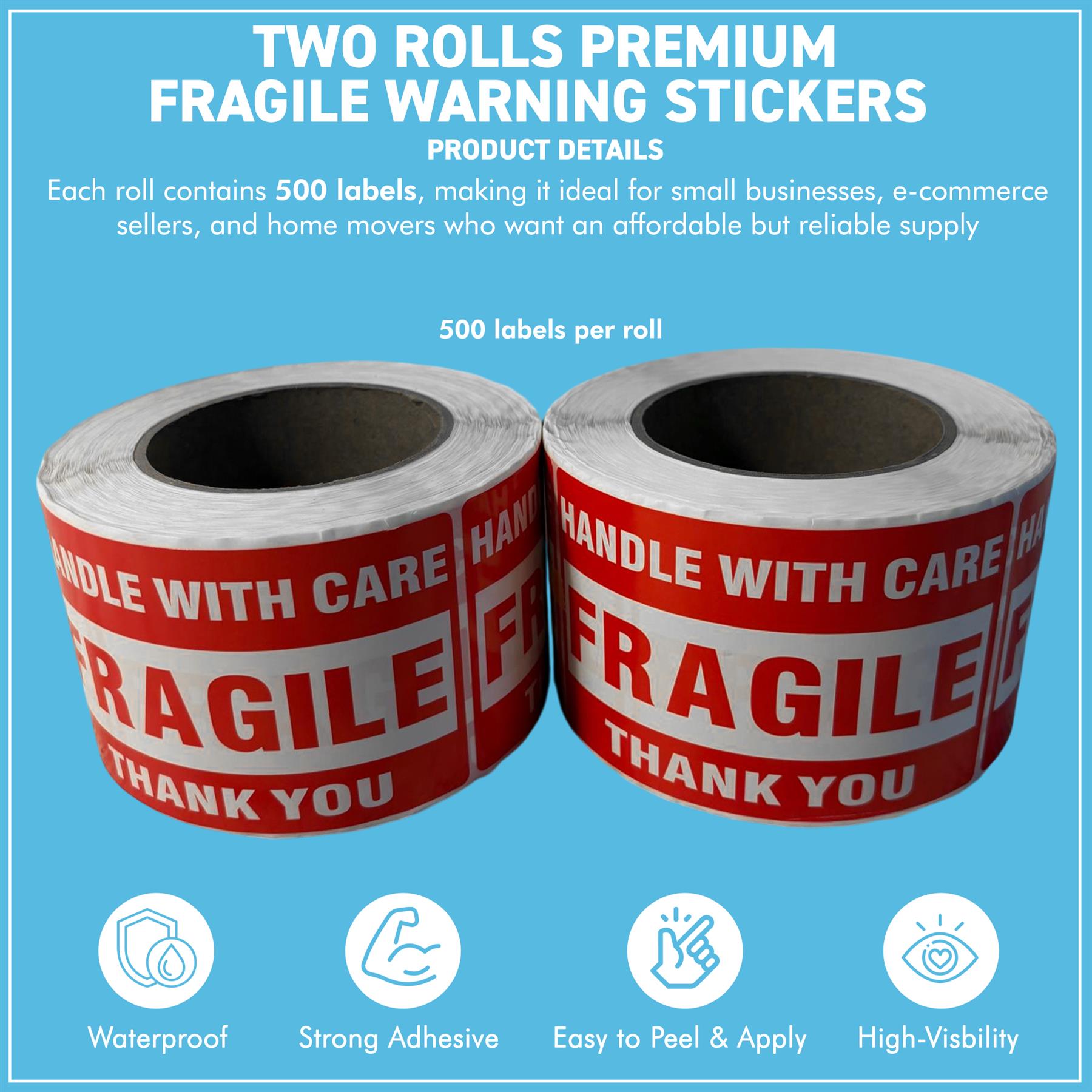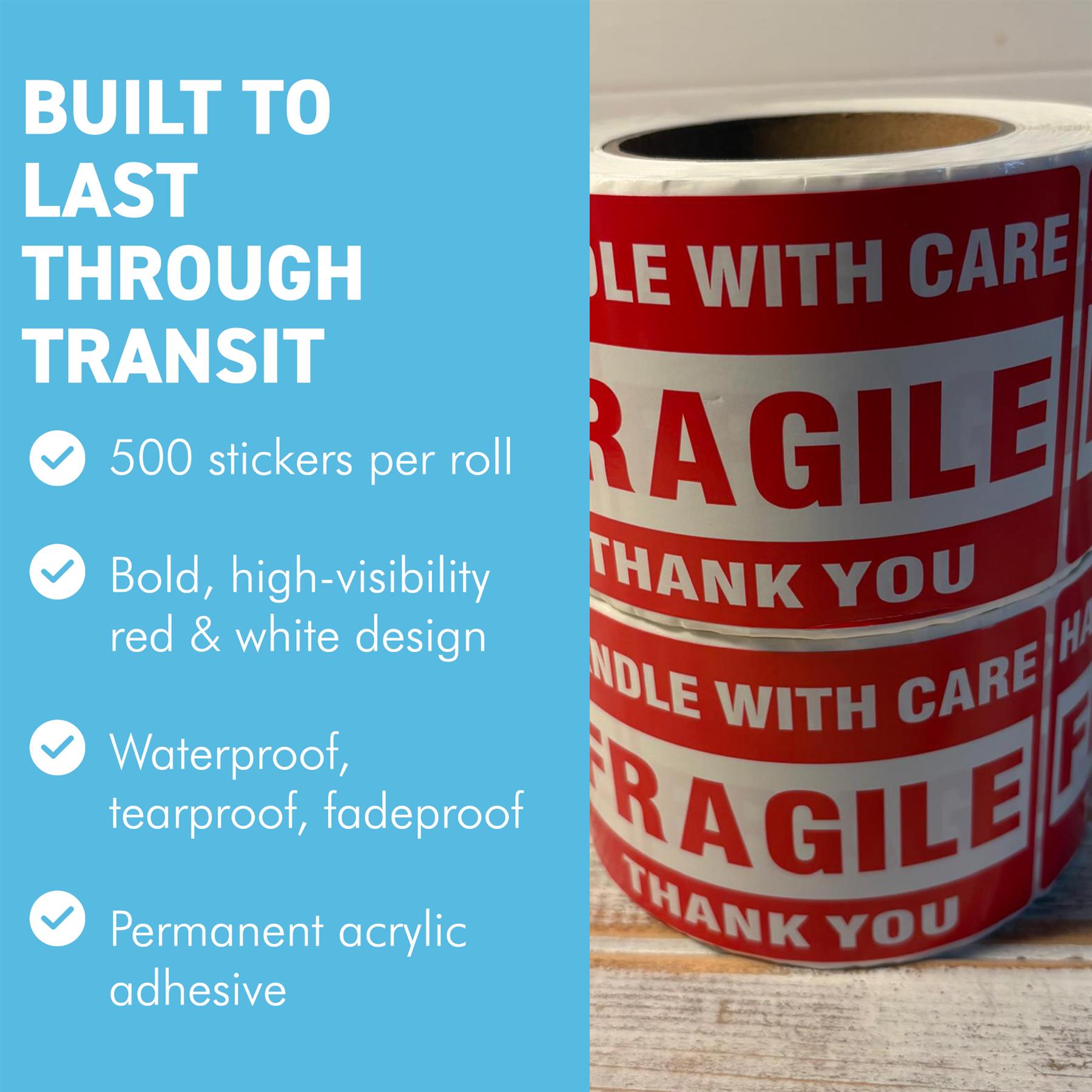 High-Visibility & Bold Design. Bright white text on a Red background with the clear message FRAGILE HANDLE WITH CARE. Designed to grab attention instantly and reduce shipping damage.