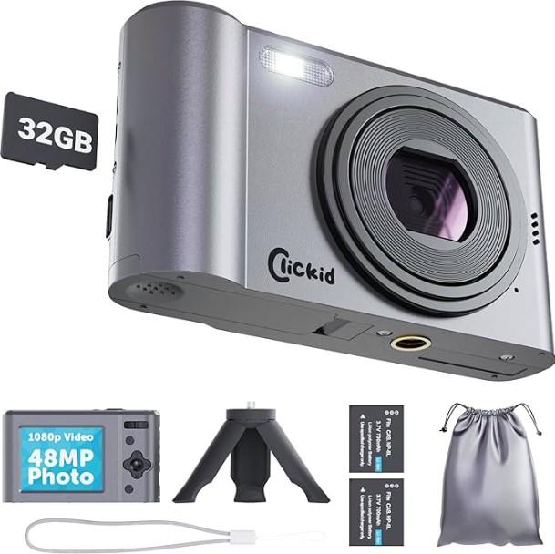 All-in-One Digital Camera with 48MP 1080p Photography and Full HD Video for Vlogging | 16x Zoom, 2.4" IPS Screen | 32GB Micro SD Card, Tripod and Extra Battery Included | ClicKid CAM20