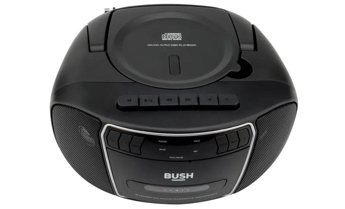 Bush CD Radio Cassette Boombox | Black with Silver trim | CD rewritable compatible | FM tuner | Stereo speakers | 2 Watts