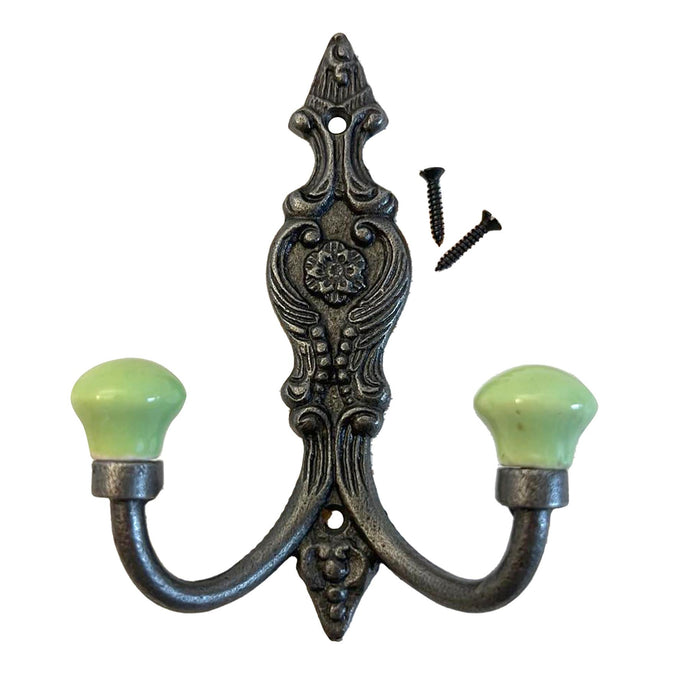 CAST IRON FRENCH STYLE DOUBLE ORNATE HOOKS | Lime green Ceramic Ball Tops | Cloakroom Hook | Decorative Double Hook, hat and coat hook | 15cm x 11cm.