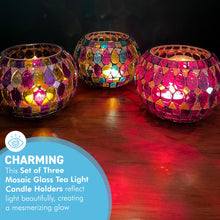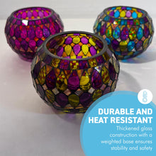 𝗘𝗟𝗘𝗚𝗔𝗡𝗧 𝗗𝗘𝗦𝗜𝗚𝗡: Transform your space with this Set of Three Mosaic Glass Tea Light Candle Holders. Each handcrafted holder features vibrant, multi-colored mosaic patterns, measuring 10cm wide by 8cm high and weighing 240g. Made with durable, heat-resistant glass and a weighted base, they combine safety and timeless style.