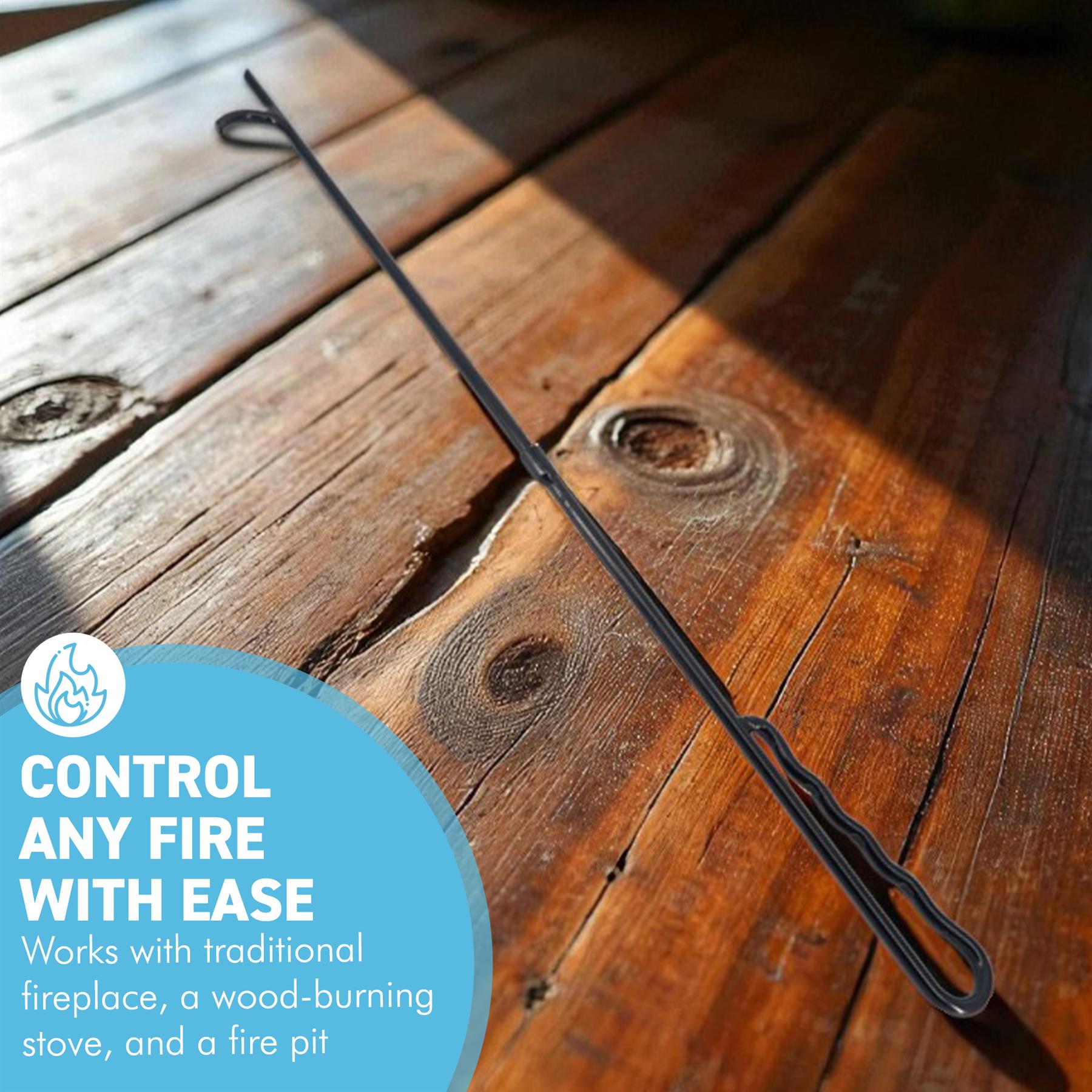 ๐—˜๐—”๐—ฆ๐—ฌ ๐—Ÿ๐—ข๐—š ๐—ง๐—จ๐—ฅ๐—ก๐—œ๐—ก๐—š & ๐—˜๐— ๐—•๐—˜๐—ฅ ๐—–๐—ข๐—ก๐—ง๐—ฅ๐—ข๐—Ÿ : Features an angled hook for efficient log repositioning, ember raking and coal stirring. Offers excellent grip and leverage for clean and controlled fire maintenance.