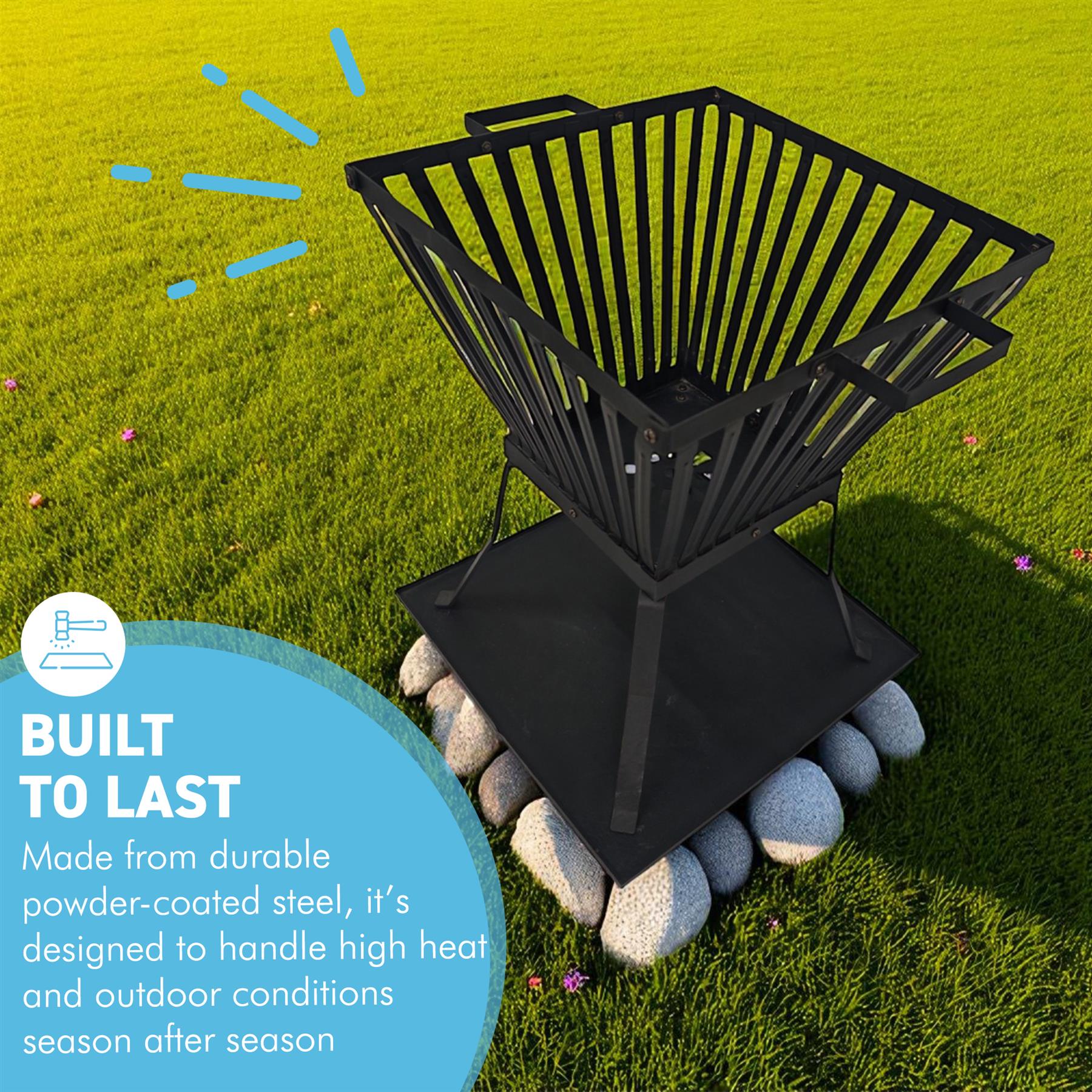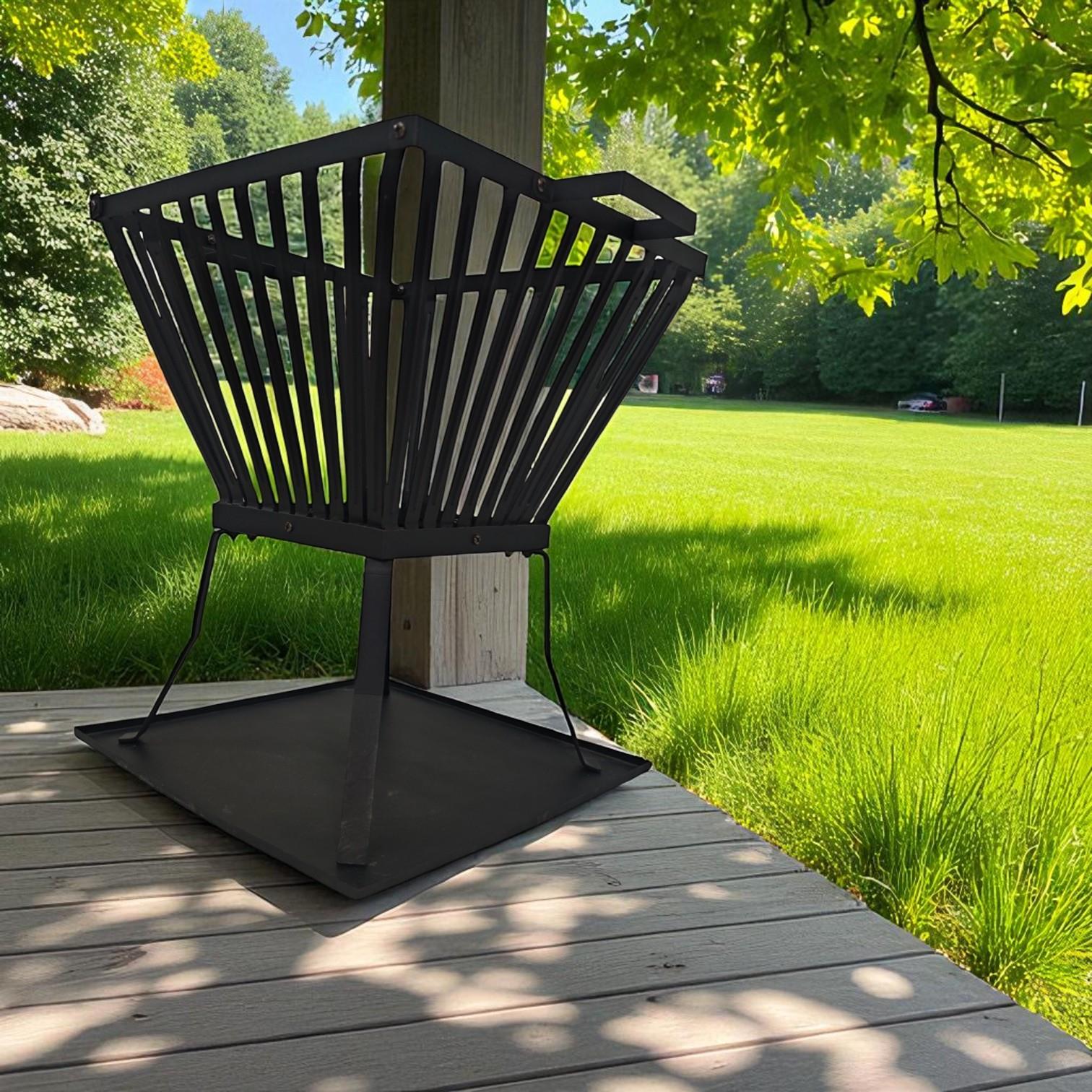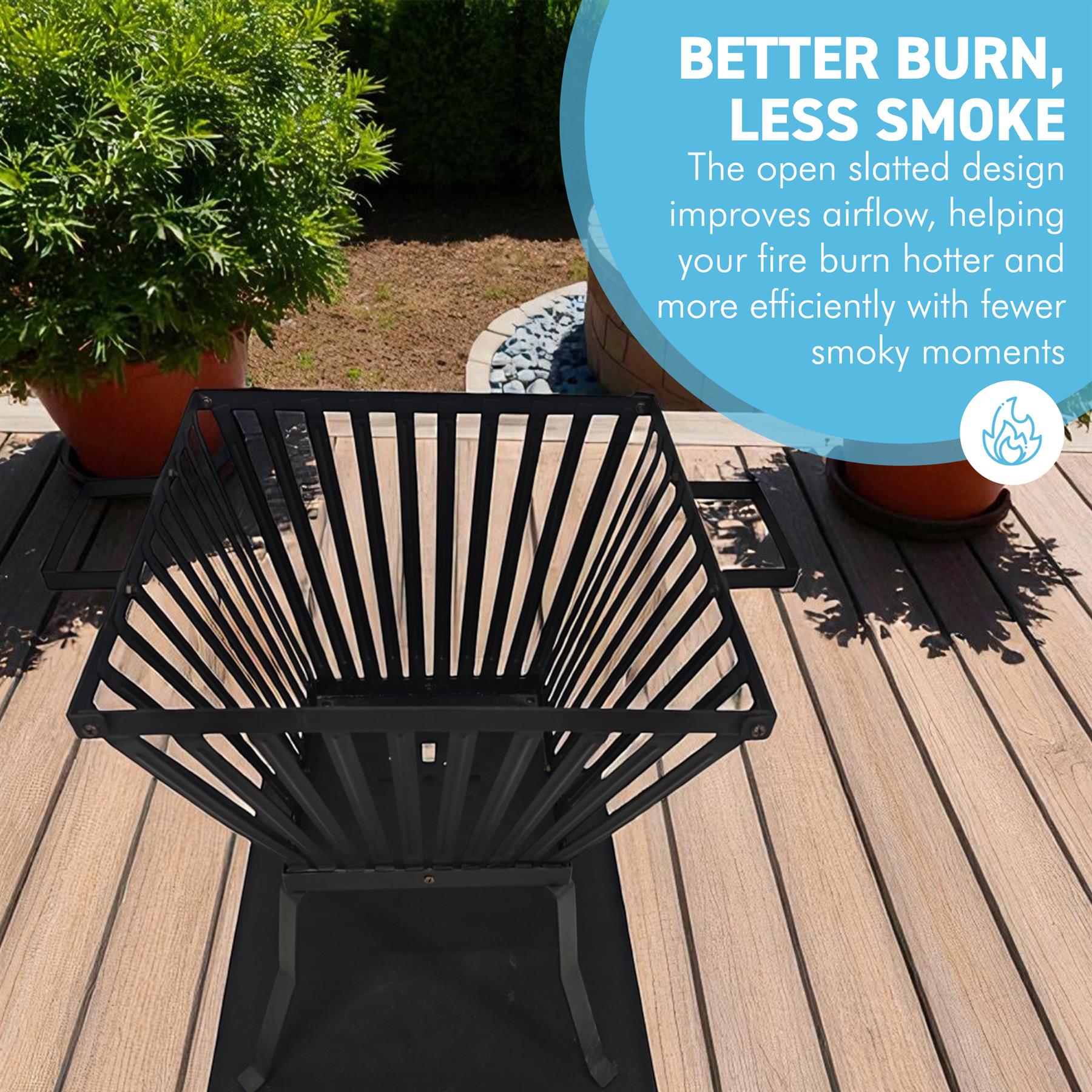 𝗥𝗔𝗜𝗦𝗘𝗗 𝗕𝗔𝗦𝗞𝗘𝗧 𝗙𝗢𝗥 𝗕𝗘𝗧𝗧𝗘𝗥 𝗔𝗜𝗥𝗙𝗟𝗢𝗪: The four-leg raised design improves airflow underneath the logs, helping fires burn hotter and cleaner with less smoke. By lifting the flames off the ground, it protects surfaces while maintaining efficient fuel burn. Perfect for patios, lawns, and outdoor seating areas, it offers stable, safe operation for regular use.