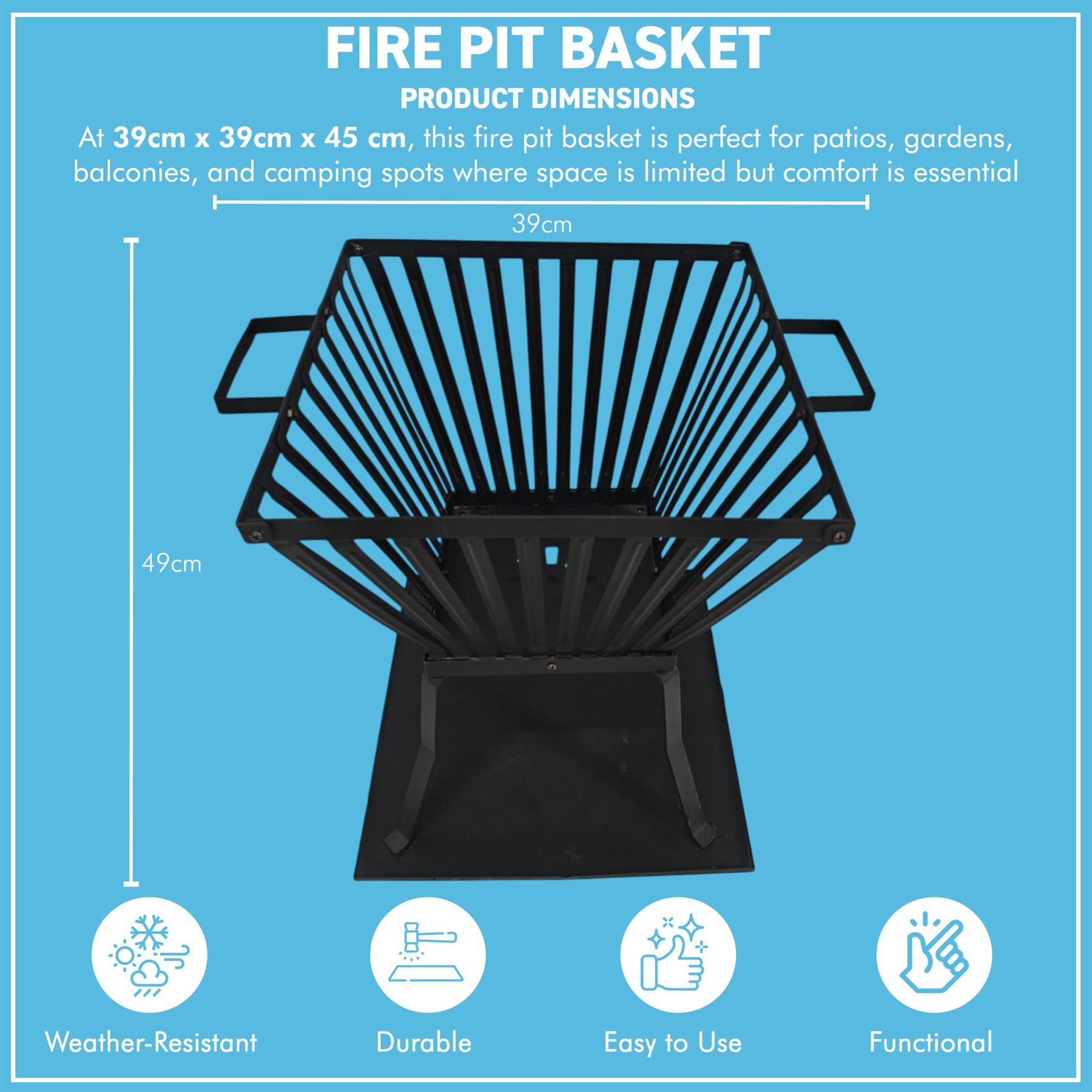 𝗛𝗘𝗔𝗩𝗬-𝗗𝗨𝗧𝗬 𝗦𝗧𝗘𝗘𝗟 𝗖𝗢𝗡𝗦𝗧𝗥𝗨𝗖𝗧𝗜𝗢𝗡: Made from steel, this standing fire basket delivers reliable heat performance and long-lasting durability. The solid frame handles frequent fires and high temperatures without warping. Ideal for year-round outdoor use, it provides consistent warmth and a stable base for burning logs during garden gatherings, patio evenings, or open-fire cooking.
