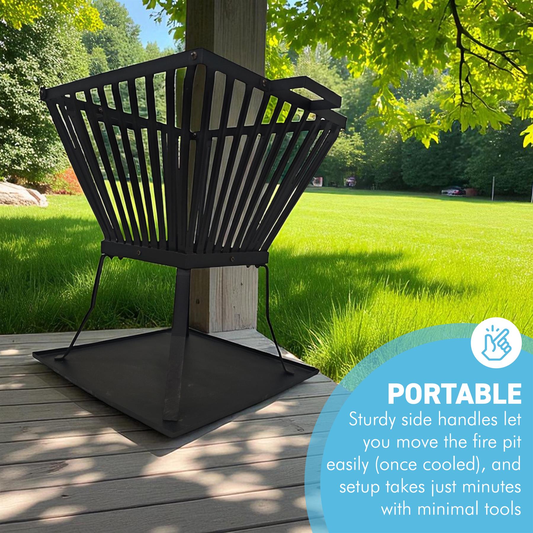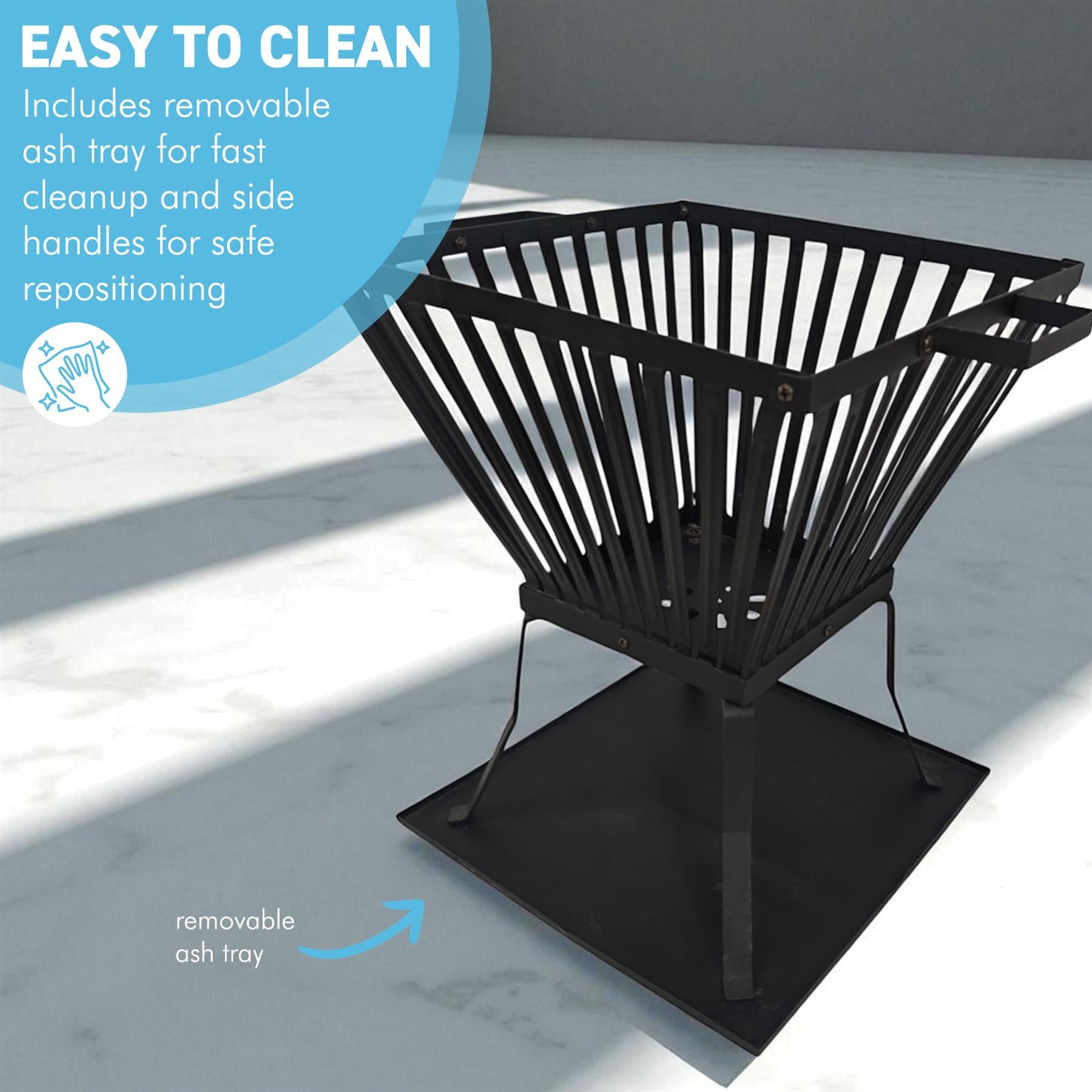 𝗥𝗘𝗠𝗢𝗩𝗔𝗕𝗟𝗘 𝗔𝗦𝗛 𝗧𝗥𝗔𝗬 𝗙𝗢𝗥 𝗘𝗔𝗦𝗬 𝗖𝗟𝗘𝗔𝗡𝗜𝗡𝗚: The ash tray sits underneath the legs collecting falling ash and embers to keep your outdoor area tidy and reduce maintenance time. Helping the fire basket stay clean and ready for the next use.