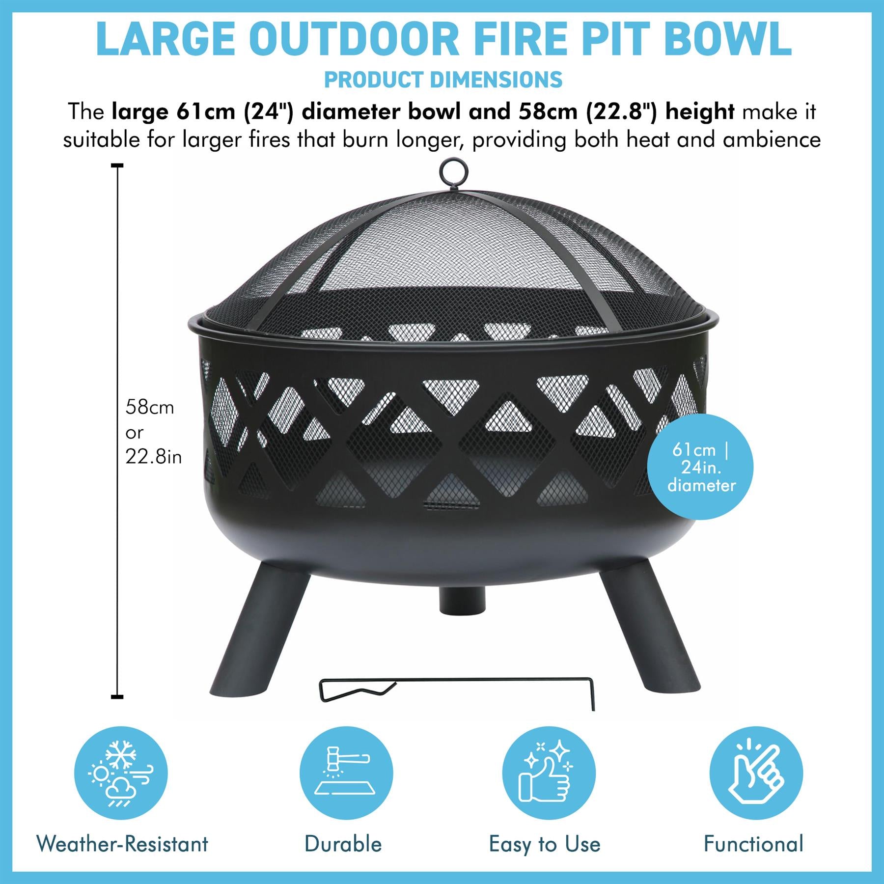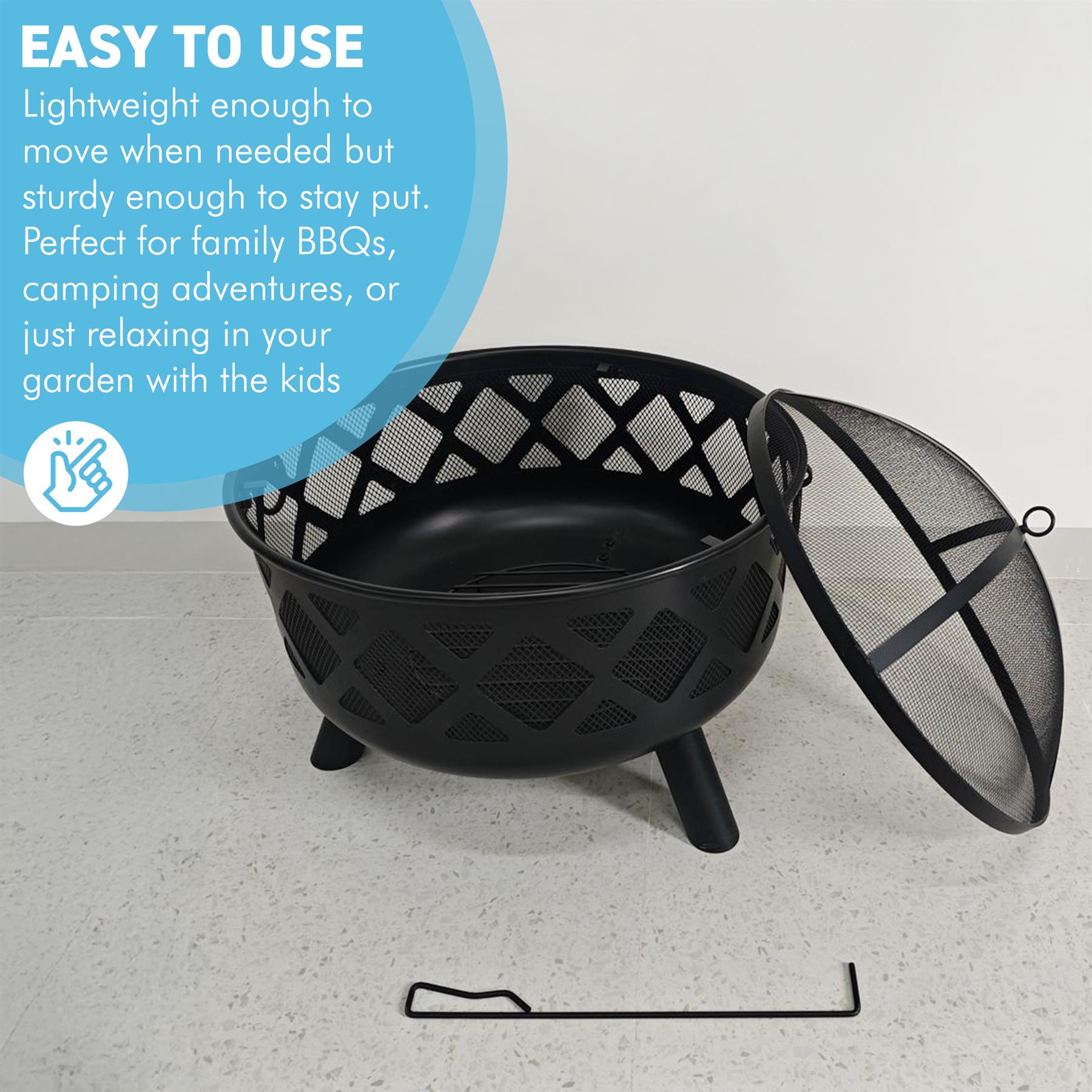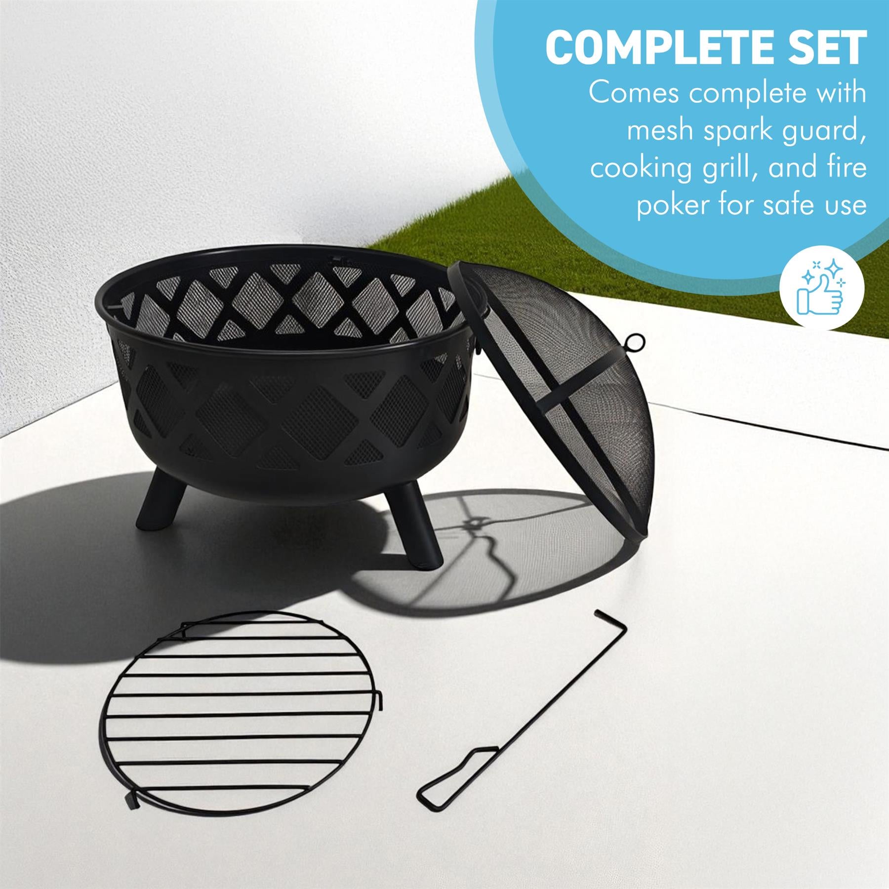 𝗦𝗔𝗙𝗘 & 𝗣𝗥𝗔𝗖𝗧𝗜𝗖𝗔𝗟 𝗔𝗖𝗖𝗘𝗦𝗦𝗢𝗥𝗜𝗘𝗦 𝗜𝗡𝗖𝗟𝗨𝗗𝗘𝗗 - This fire pit comes complete with a protective mesh cover to contain sparks and embers, a safety poker for managing the fire. The deep bowl design promotes excellent airflow for longer, more efficient fires.