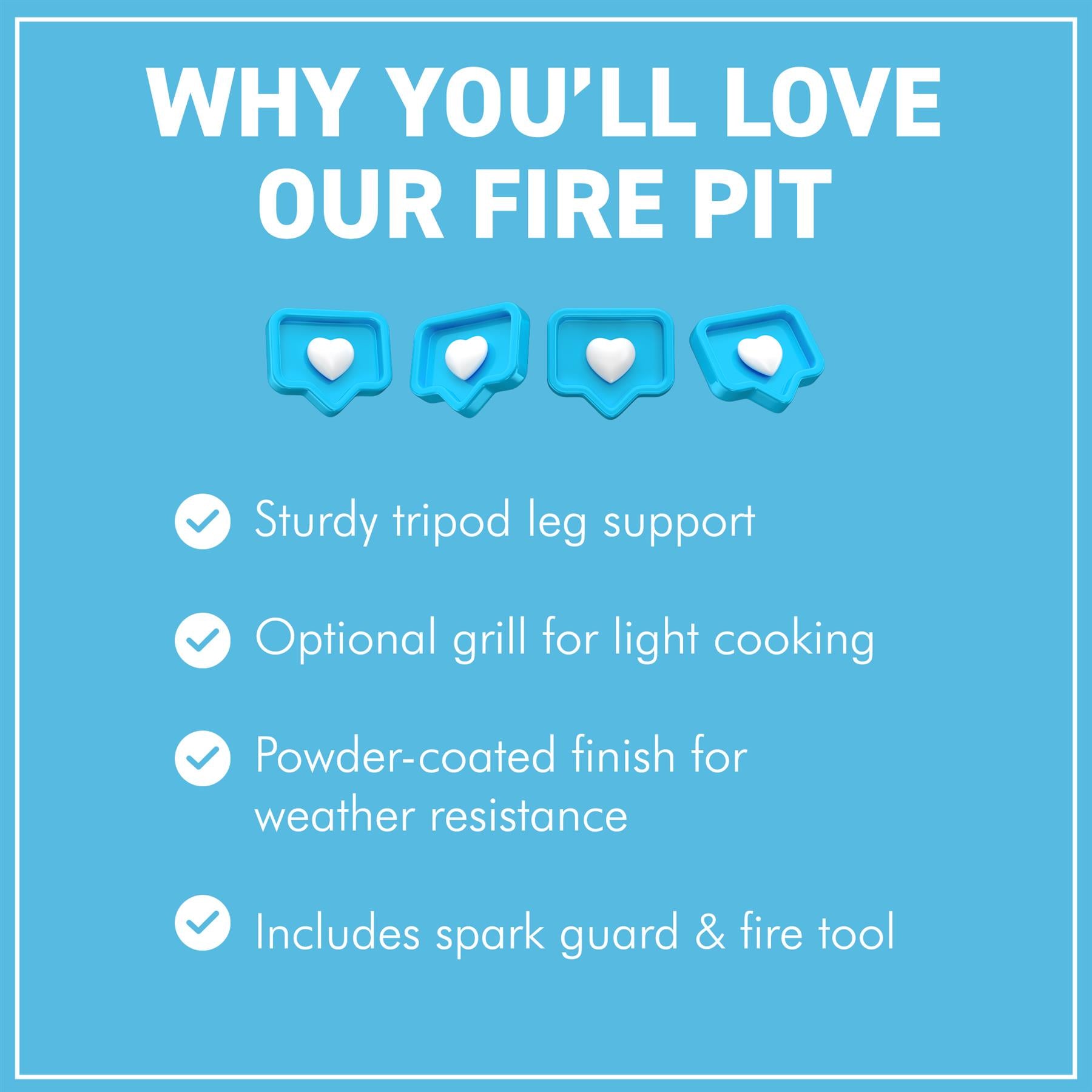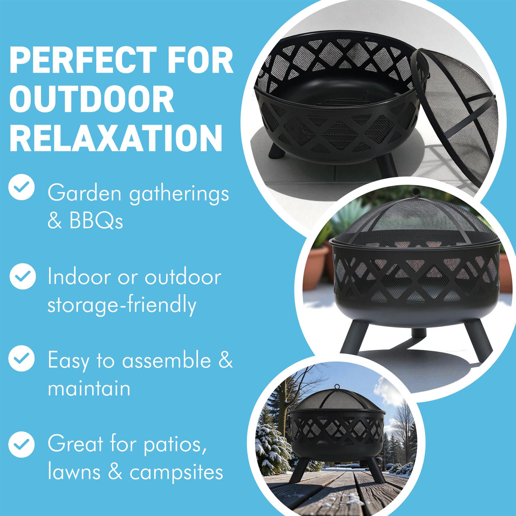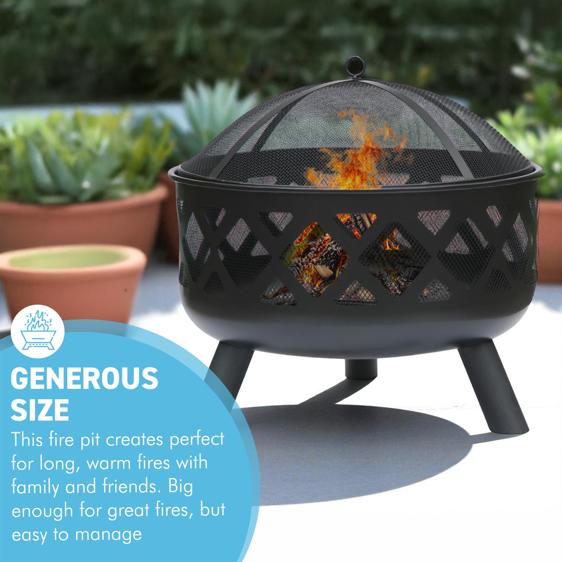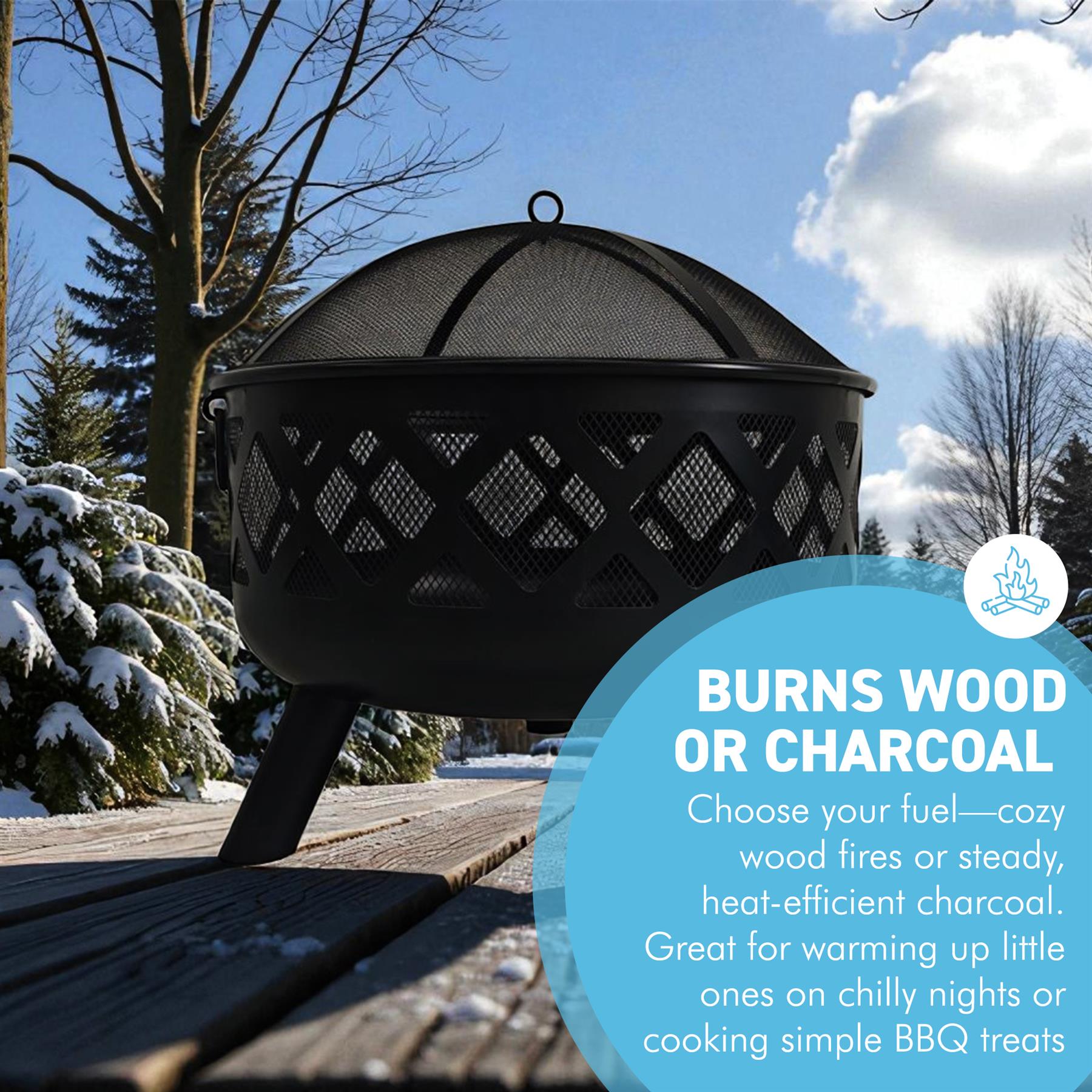 𝗦𝗔𝗙𝗘 & 𝗣𝗥𝗔𝗖𝗧𝗜𝗖𝗔𝗟 𝗔𝗖𝗖𝗘𝗦𝗦𝗢𝗥𝗜𝗘𝗦 𝗜𝗡𝗖𝗟𝗨𝗗𝗘𝗗 - This fire pit comes complete with a protective mesh cover to contain sparks and embers, a safety poker for managing the fire. The deep bowl design promotes excellent airflow for longer, more efficient fires.