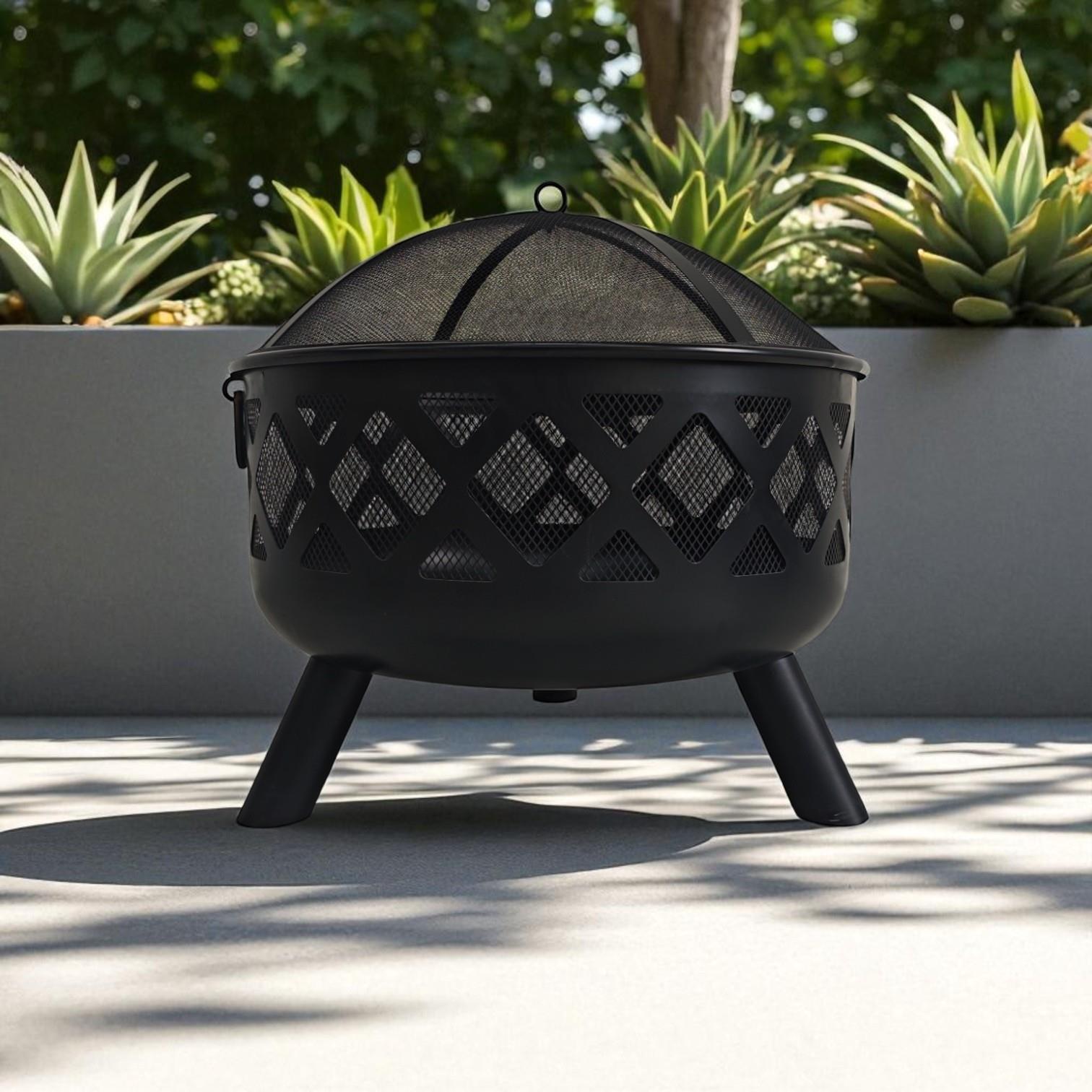 𝗦𝗧𝗬𝗟𝗜𝗦𝗛 & 𝗗𝗨𝗥𝗔𝗕𝗟𝗘 𝗗𝗘𝗦𝗜𝗚𝗡 - Enjoy cozy evenings outdoors with this large, modern black fire pit bowl. Crafted from durable steel with a heat-resistant painted finish, it’s built to withstand high temperatures and regular use. The sleek round shape and decorative lattice design add an elegant touch to any patio, garden, or outdoor space, combining style with practicality.