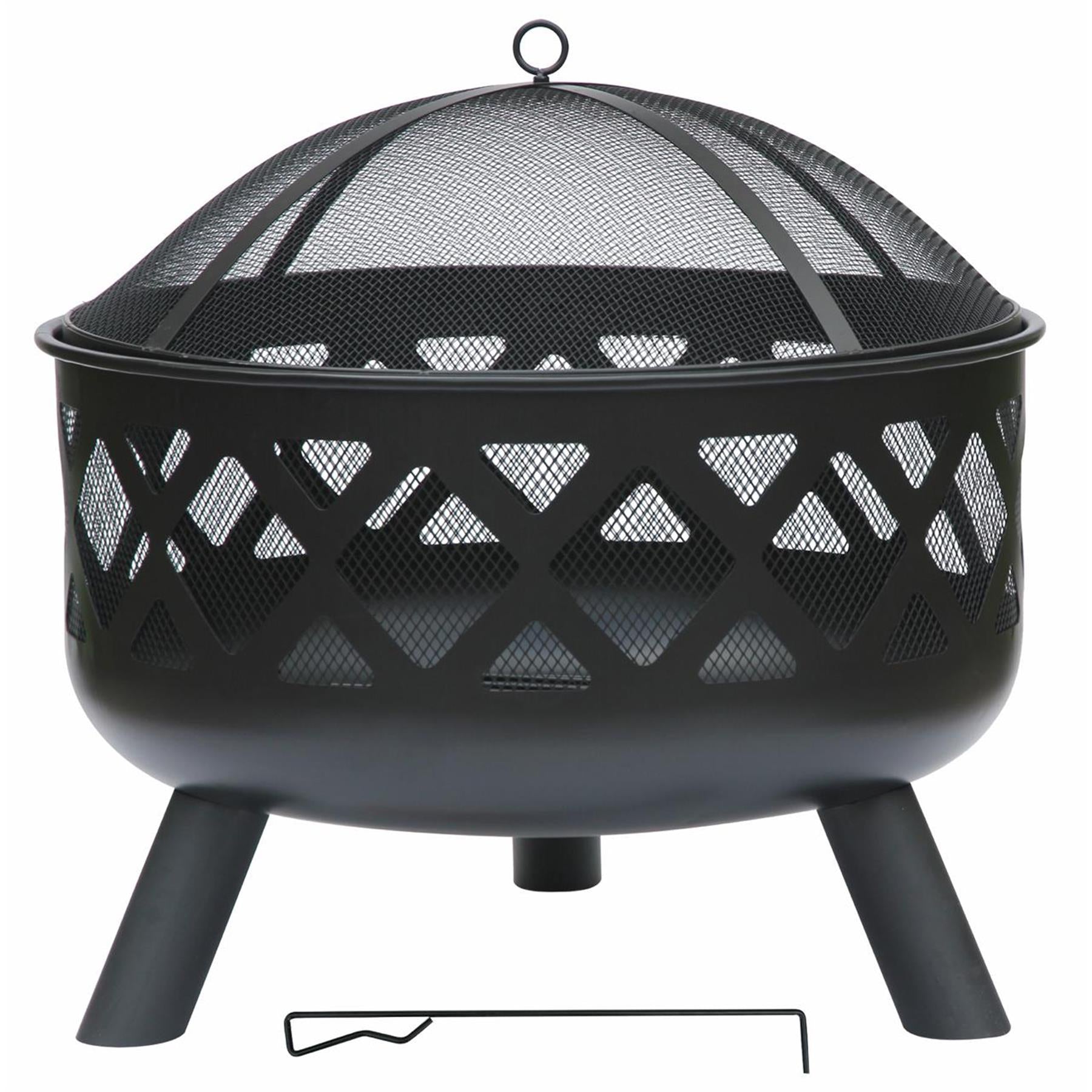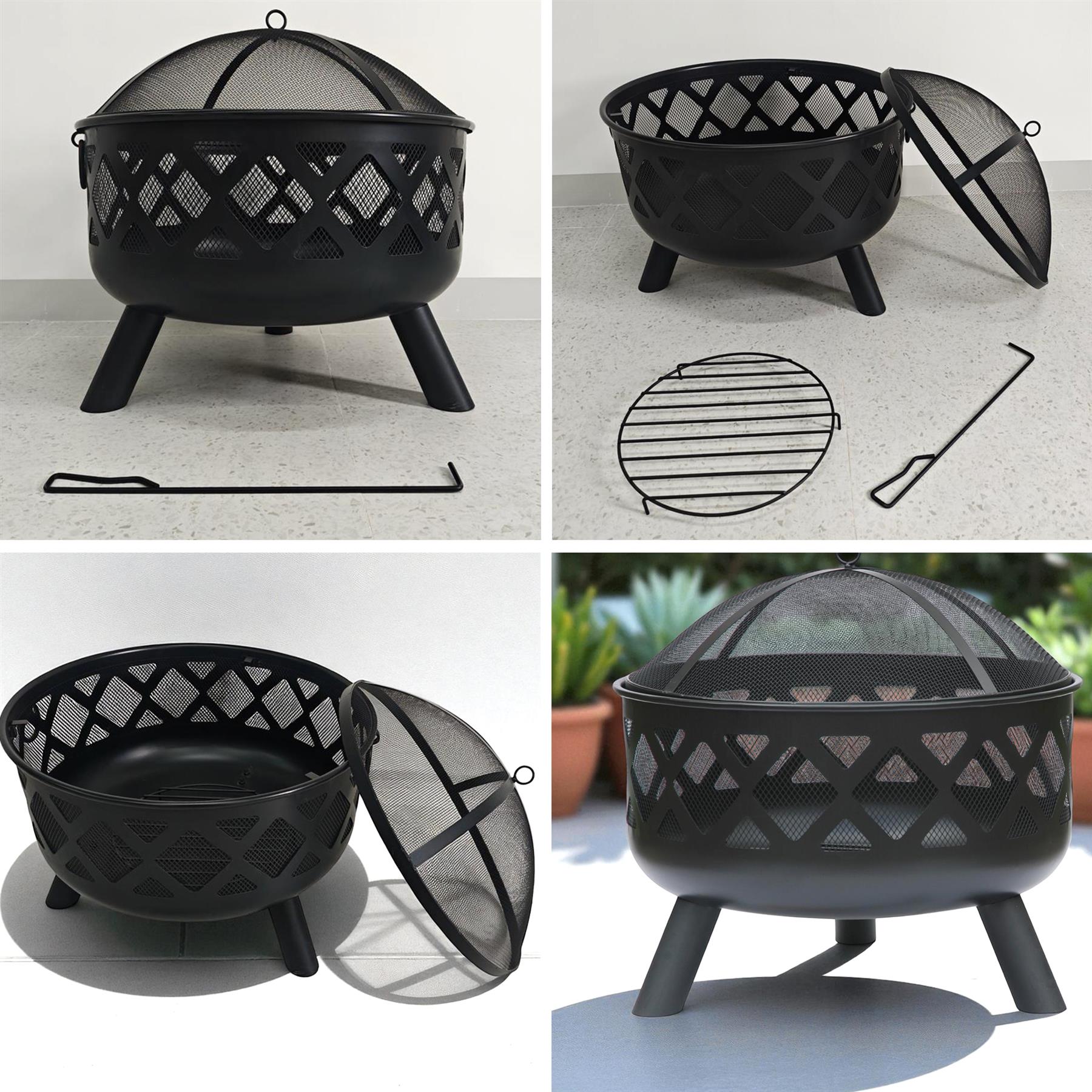 𝗣𝗥𝗢𝗗𝗨𝗖𝗧 𝗗𝗜𝗠𝗘𝗡𝗦𝗜𝗢𝗡𝗦 & 𝗦𝗣𝗘𝗖𝗜𝗙𝗜𝗖𝗔𝗧𝗜𝗢𝗡𝗦 - HEIGHT 58 CM X WIDTH 61 CM X LENGTH 61 CM. MATERIAL: STEEL. FINISH: BLACK HEATPROOF PAINT. Includes mesh cover, poker, and log grate. Suitable for wood or charcoal burning. Simple home assembly required.