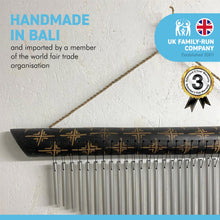 The wind chime is made from bamboo with 30 aluminium chimes, decorated with etching to produce a very pretty pattern across the top length of bamboo. It is a great addition anywhere in the home or garden and creates a magical tinkling as the chimes strike together.
