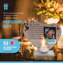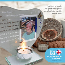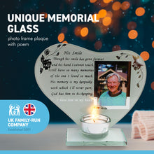 This heart shaped glass memorial candle and photo holder is a thoughtful gift remembrance ornament for someone that has lost someone close to them, a simple but though provoking way to keep the presence of a loved one close to your heart and in your mind, suitable for use as a Dad memorial gift or Pops, Father, Dad, Granddad, Grandfather, Son, Brother or Uncle