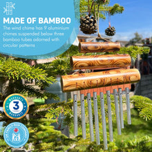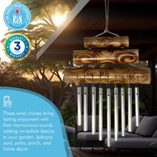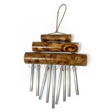 The wind chime is made from bamboo with 9 aluminium chimes, the chimes are suspended below three bamboo tubes that are decorated with circular patterns.