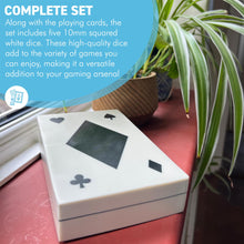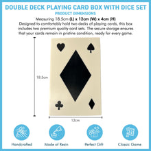 Ideal for game nights, gatherings, or a laid-back evening at home, this set guarantees hours of entertainment. Presented in a luxurious resin box with sections for cards and dice, it adds an elegant touch. Includes two premium playing card sets and five 10mm white dice, perfect as a gift or for personal enjoyment.