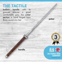 The tactile bobbin handle with its grooves ensures a GOOD COMFORTABLE GRIP, the poker section is hand forged from 8mm round iron bar, in the manufacturing process of the steel there is some discolouration however this adds to the overall appearance of these unique items