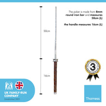 The poker is made from 8mm round iron bar and measures 50cm (L) 20 inches, the handle measures 16cm (L) | 6.5 inches, please note these are all individually made and not mass produced therefore the colours and details might vary slightly.
