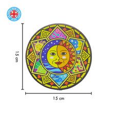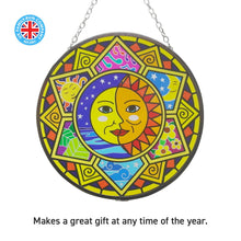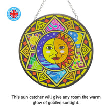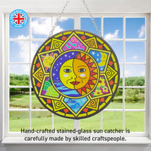 The hand painted sun and moon design captured in this magical glass suncatcher will create a stunning light display in your home, hang it in a window and watch as the sun projects a vivid array of joyously coloured rays into your home.