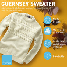 This pure BRITISH WOOL GUERNSEY SWEATER, also known as a fisherman sweater, has stood the test of time for over 400 years. Originally designed to withstand the harsh conditions at sea, these sweaters were tightly knitted to provide exceptional insulation, wind resistance, and water resistance.