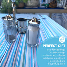 𝗖𝗼𝗺𝗽𝗮𝗰𝘁 𝗮𝗻𝗱 𝗗𝘂𝗿𝗮𝗯𝗹𝗲: Crafted from premium materials, this cruet set measures 13cm (W) x 5cm (D) x 14cm (H) with shakers at 4cm diameter x 8cm (H). Weighing 570g, it offers a sturdy yet lightweight design, ideal for daily use and special events.
