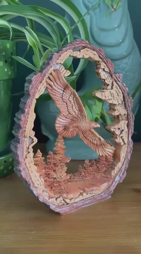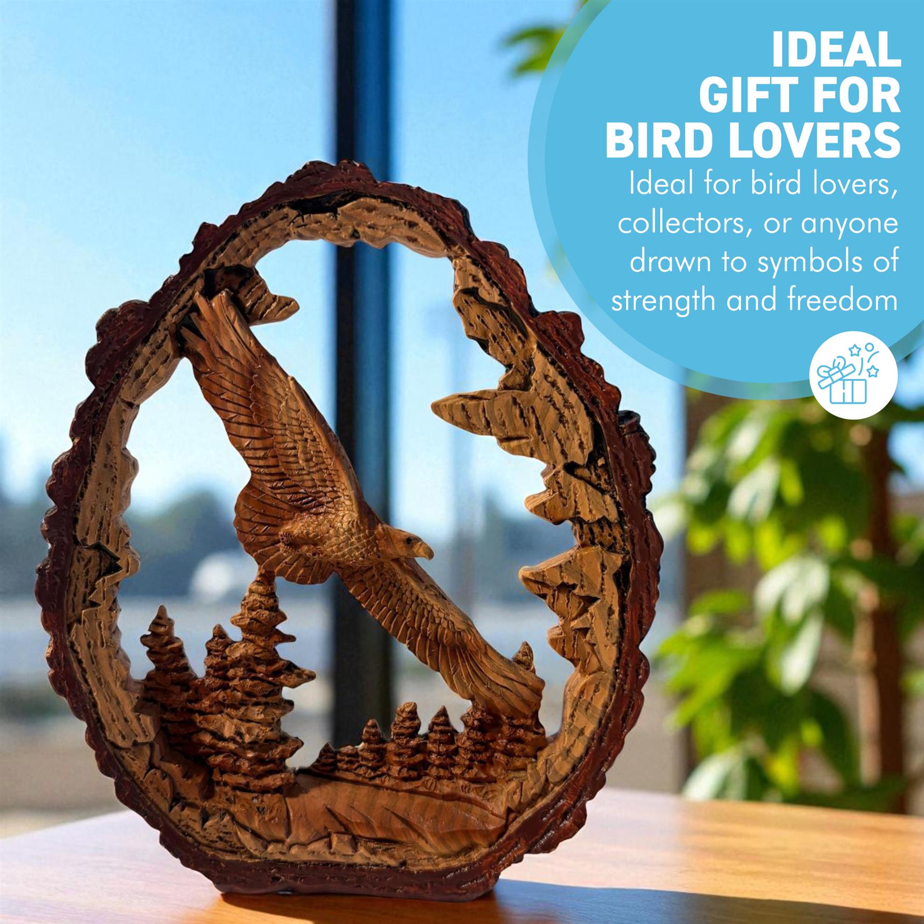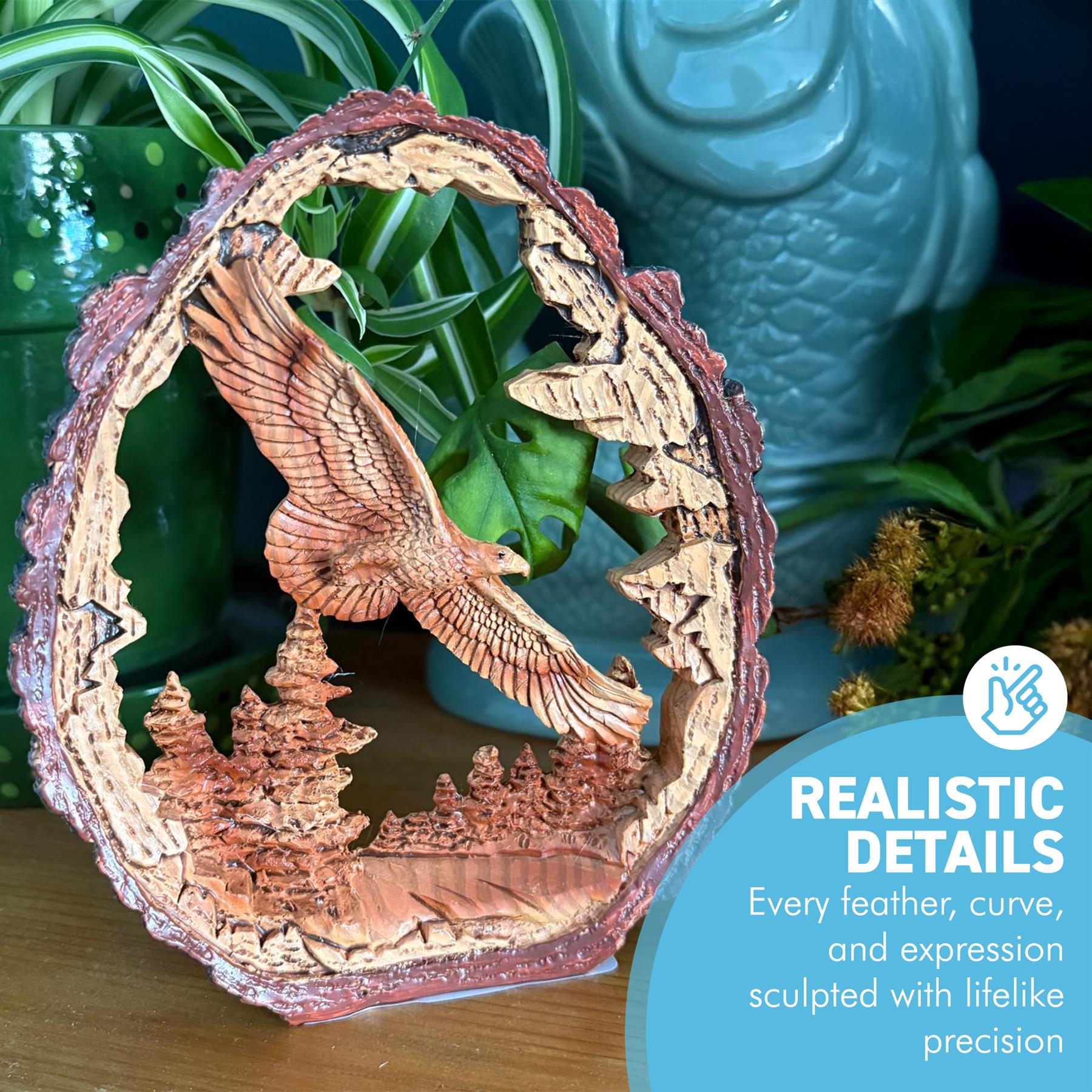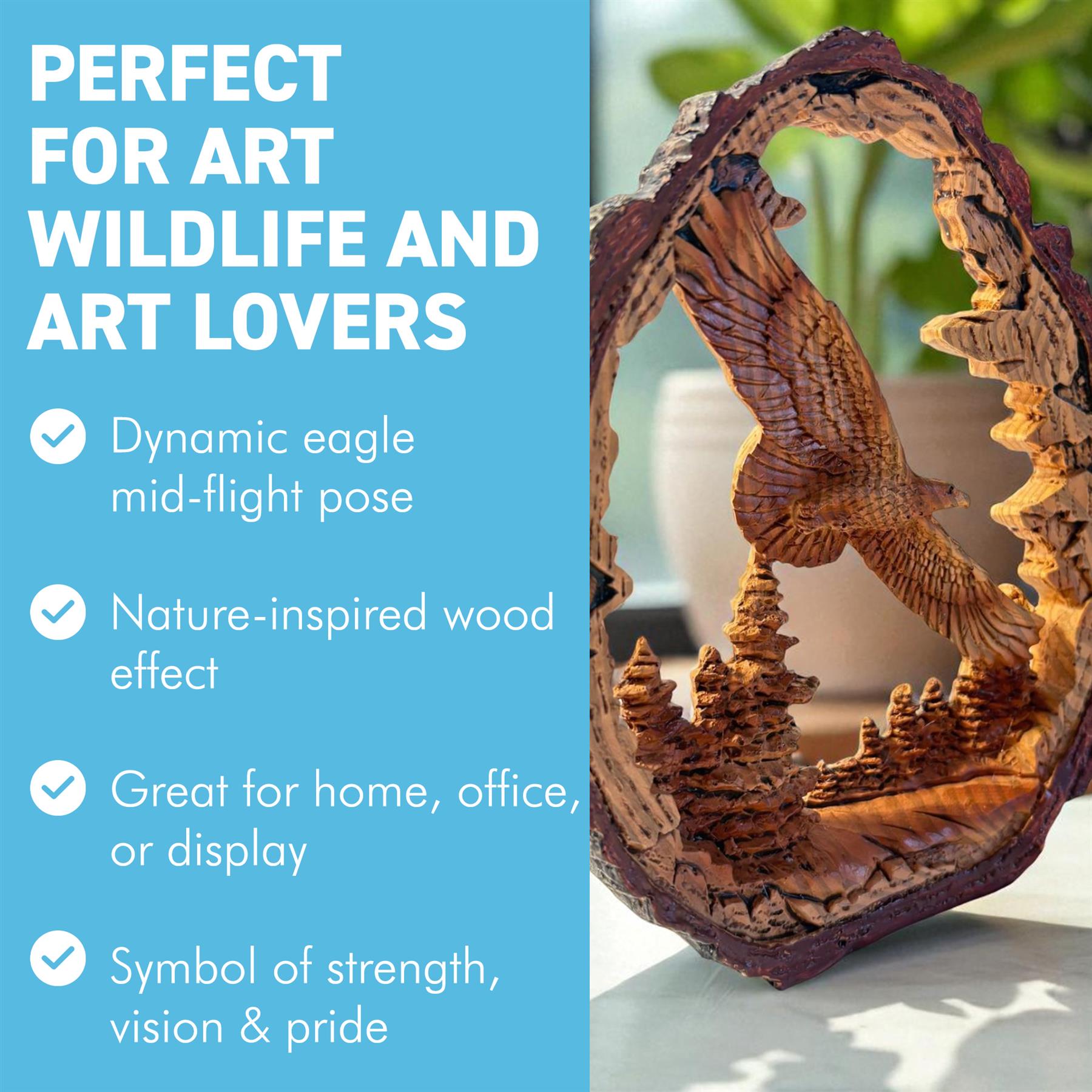 𝗘𝗫𝗖𝗘𝗣𝗧𝗜𝗢𝗡𝗔𝗟 𝗗𝗘𝗧𝗔𝗜𝗟𝗜𝗡𝗚 & 𝗖𝗥𝗔𝗙𝗧𝗦𝗠𝗔𝗡𝗦𝗛𝗜𝗣 : Crafted from high-quality materials, this bird of prey sculpture brings every feather, curve, and detail to life. Its lifelike design enhances any space, from shelves and mantels to display cases, adding a touch of natural elegance and outdoor beauty to your home or office.