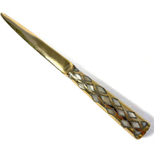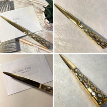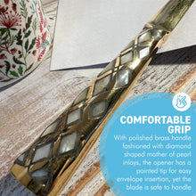 𝗗𝗘𝗖𝗢𝗥𝗔𝗧𝗜𝗩𝗘 𝗔𝗡𝗗 𝗘𝗙𝗙𝗘𝗖𝗧𝗜𝗩𝗘: measuring 22cm in length, with a 9.5cm polished brass handle fashioned with diamond shaped mother of pearl inlays, the opener has a pointed tip for easy envelope insertion, yet the blade is safe to handle.