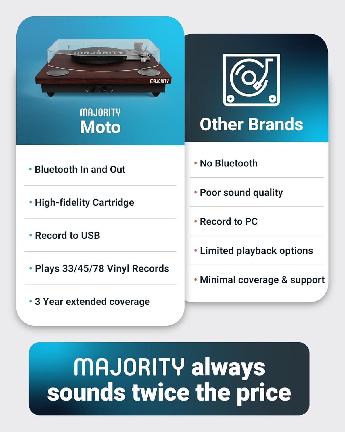 ๐๐๐จ๐๐ง๐ข๐ข๐ง๐ ๐๐ก & ๐ข๐จ๐ง: Majority Moto Bluetooth record player allows music lovers to seamlessly connect the vinyl player to external speakers or stream music from their phone directly to the Moto's built-in speakers.