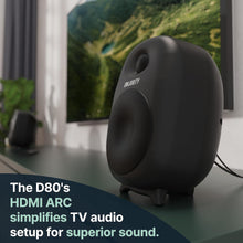 REFURBISHED BLUETOOTH, ACTIVE, HDMI, ARC Effortlessly pair your smartphone or any Bluetooth-enabled device with the D80's. Built-in amplifiers and comes with HDMI ARC connectivity allowing shared remote use and faster digital sound processing.