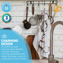 The tea towel showcases these delightful creatures, featuring a charming and detailed puffin design that brings a touch of COASTAL BEAUTY to your kitchen. This Tea Towel is not only visually appealing but also HIGHLY FUNCTIONAL. Whether you are looking for a housewarming gift or a present for a bird lover, this tea towel is sure to bring a smile to their face.