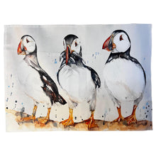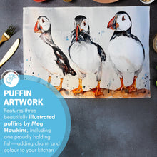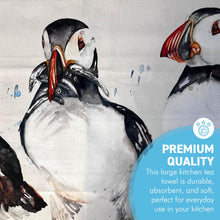 ๐๐ต๐ฎ๐ฟ๐บ๐ถ๐ป๐ด ๐ฃ๐๐ณ๐ณ๐ถ๐ป ๐๐น๐น๐๐๐๐ฟ๐ฎ๐๐ถ๐ผ๐ป: This high-quality tea towel showcases three puffins standing in a row, each displaying its unique black-and-white plumage, beady eyes, and striking orange and red beaks. The middle puffin holds a small group of silvery fish in its beak, capturing the moment after a successful hunt and adding a playful touch to the design.