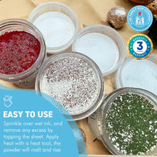 Sprinkle over wet ink, and remove any excess by tapping the sheet. Apply heat with a heat tool, the powder will melt and rise. Allow a few minutes of drying time for the powder to solidify